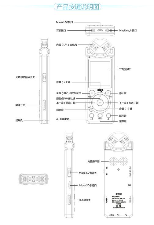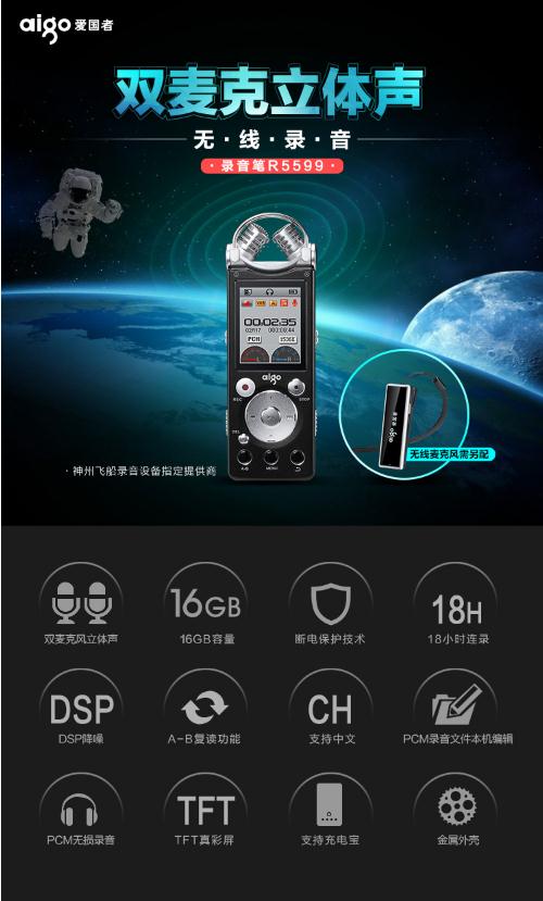 - 商品名称:爱国者(aigo)录音笔 R5599 16G 微型专业50米无线录音 降噪远距离双麦克 学习/会议采访取证 HIFI播放 黑色