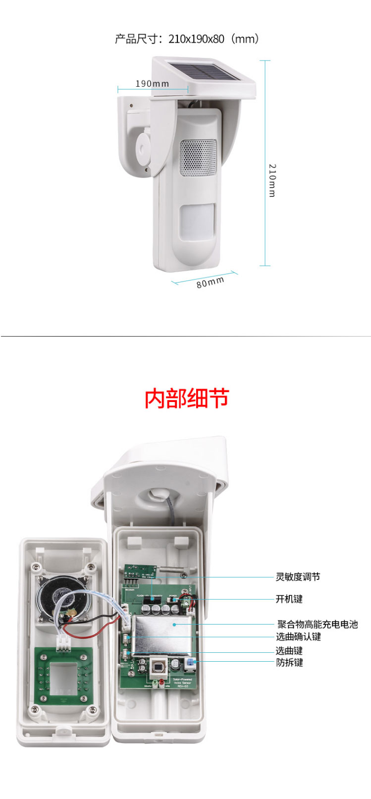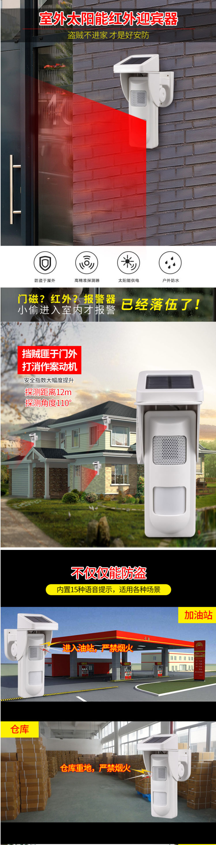太阳能持续充电供电 高强度闪灯和喇叭 免布线抗干扰 180°自由旋转 灵敏度可调节