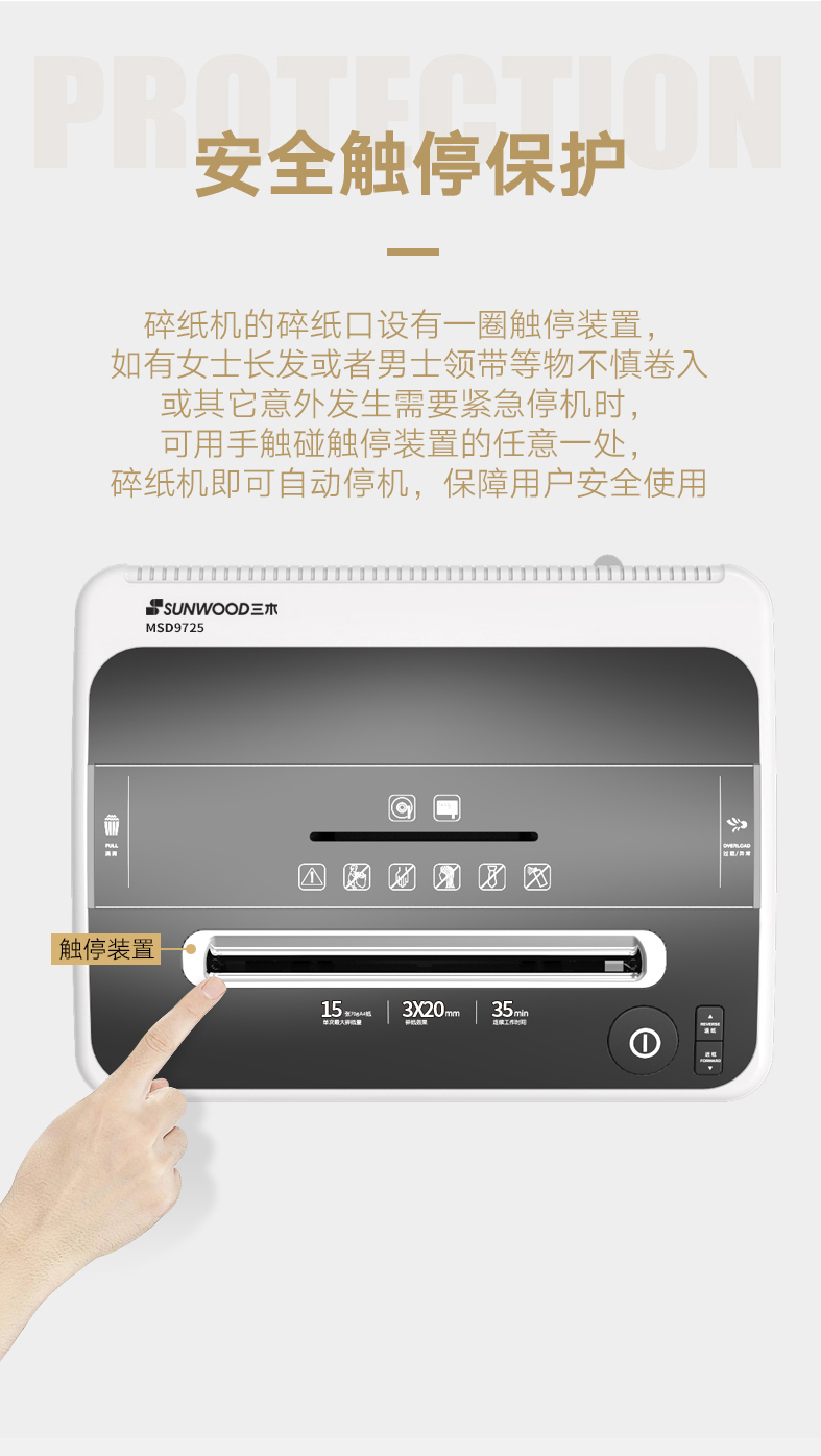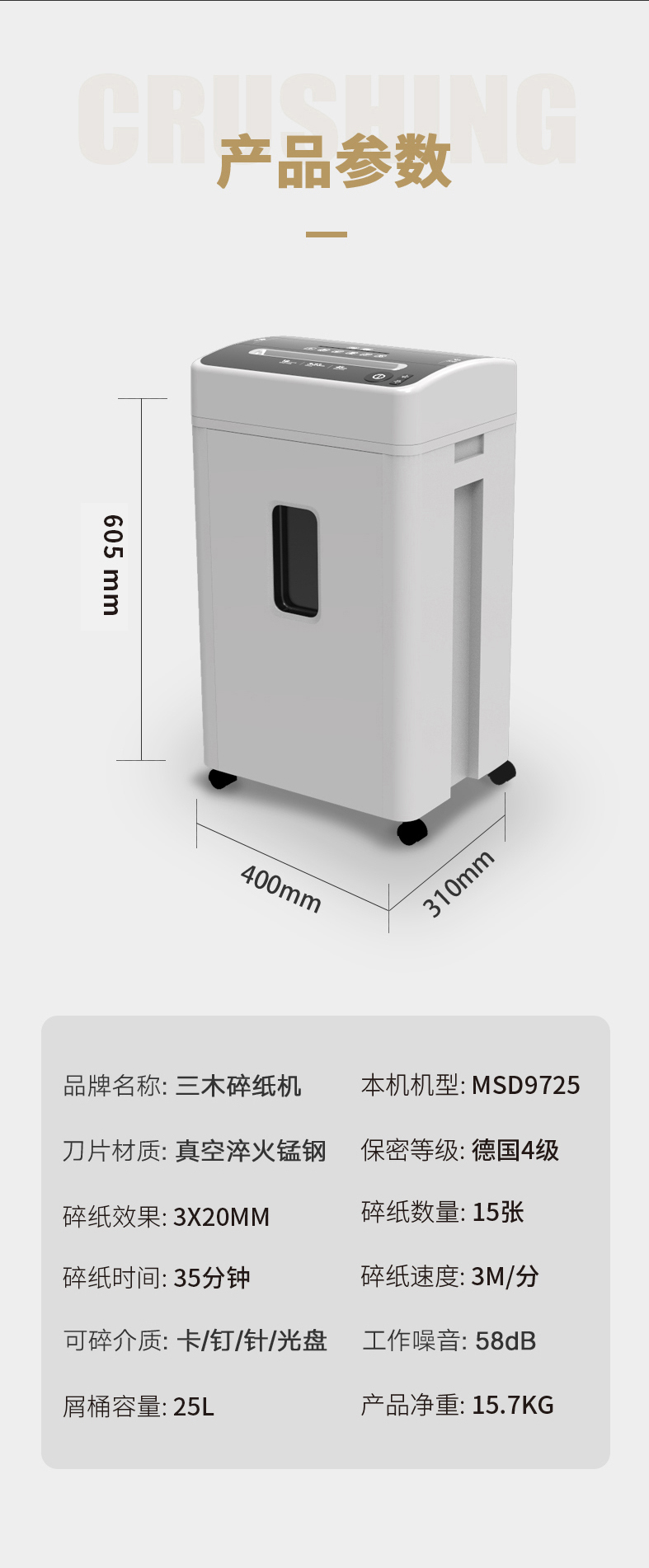 - 商品名称:三木(SUNWOOD) MSD9725 锰钢侠系列碎纸机/文件粉碎器/双入口/安全触停 四级保密