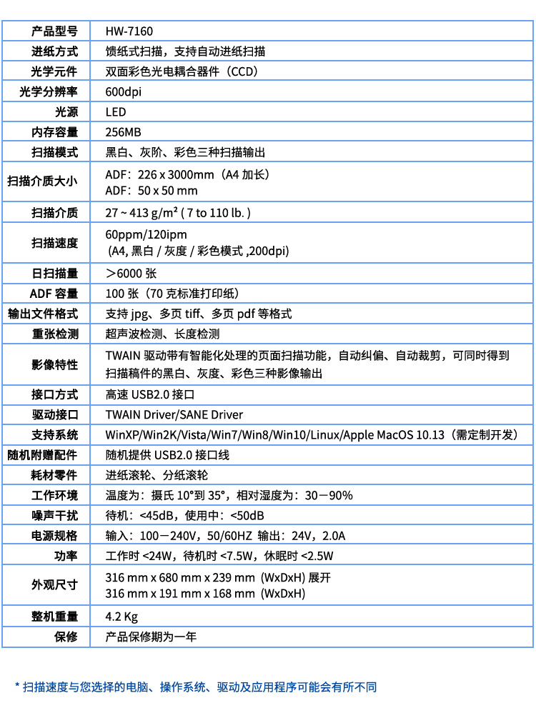 - 商品名称:汉王(Hanvon)HW-7160馈纸式高速档案扫描仪A4幅面CCD商用办公文件文档60ppm/120ipm