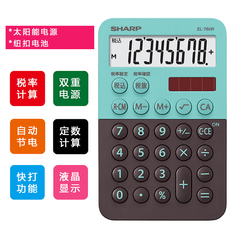 - 商品名称:夏普SHARP 小号计算器迷你便携8位双重电源电子计算机带税率计算功能可爱时尚糖果色EL-760 EL-760R-GX绿色一个