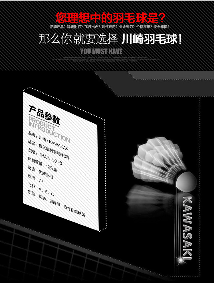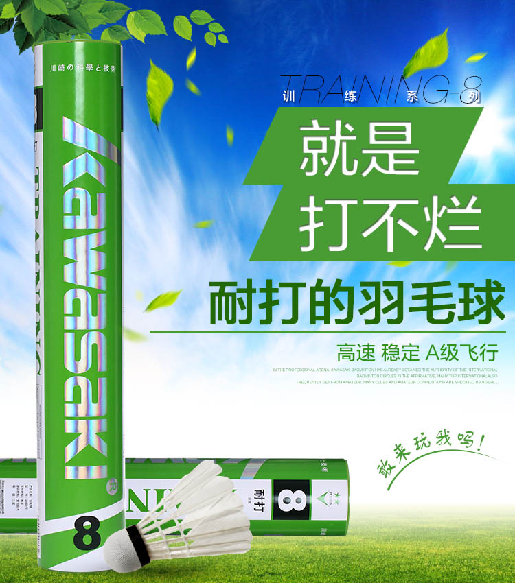 商品名称:川崎Kawasaki羽毛球 训练级 耐打 8号球 12个装training 8
