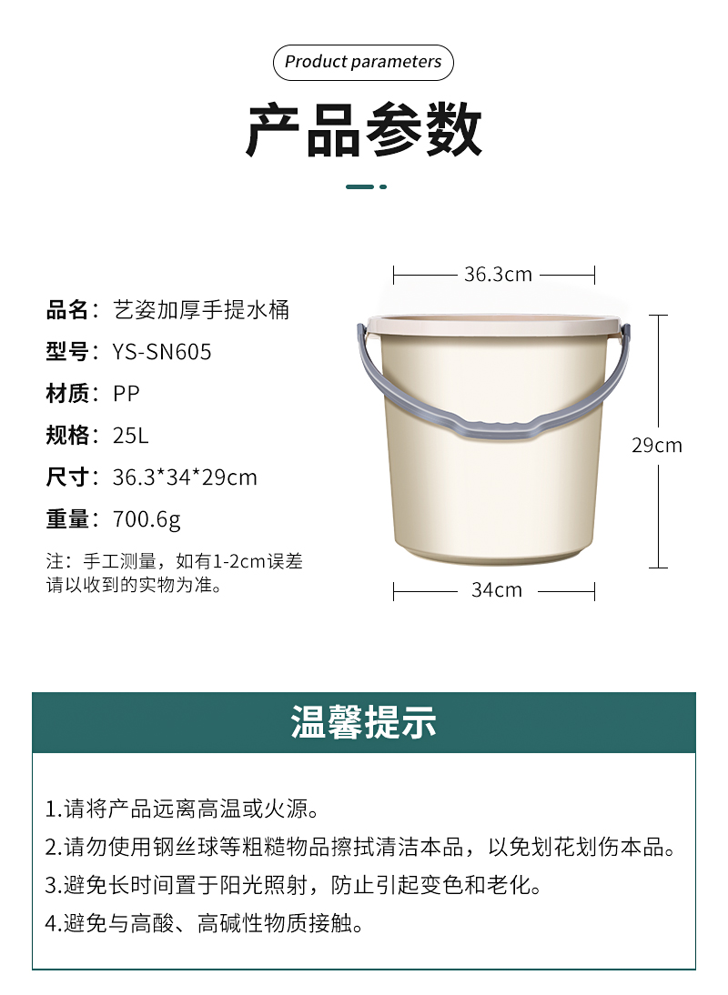 - 商品名称:艺姿塑料加厚耐用提水桶大容量洗澡泡脚桶家用洗车拖把桶25L YZ-SN605