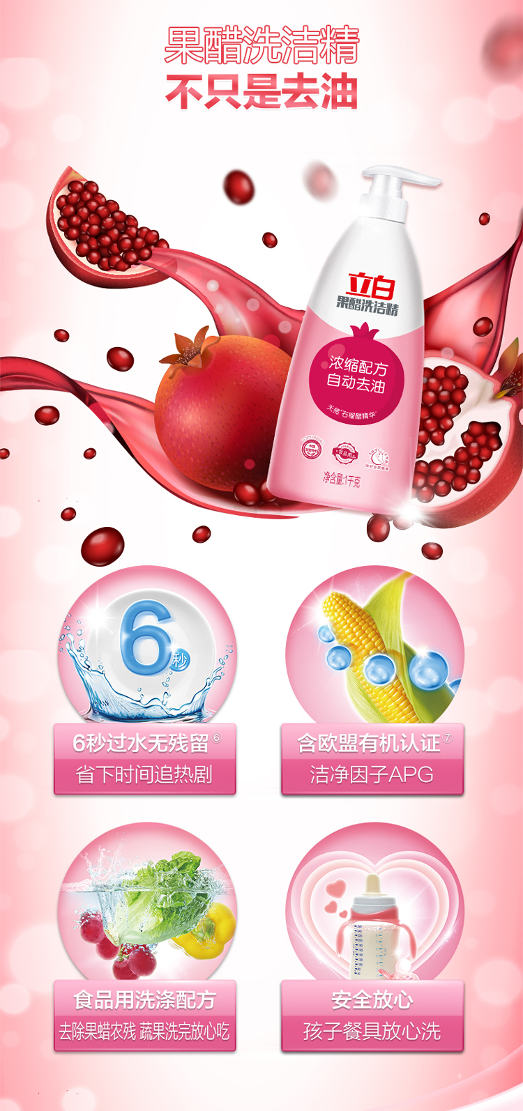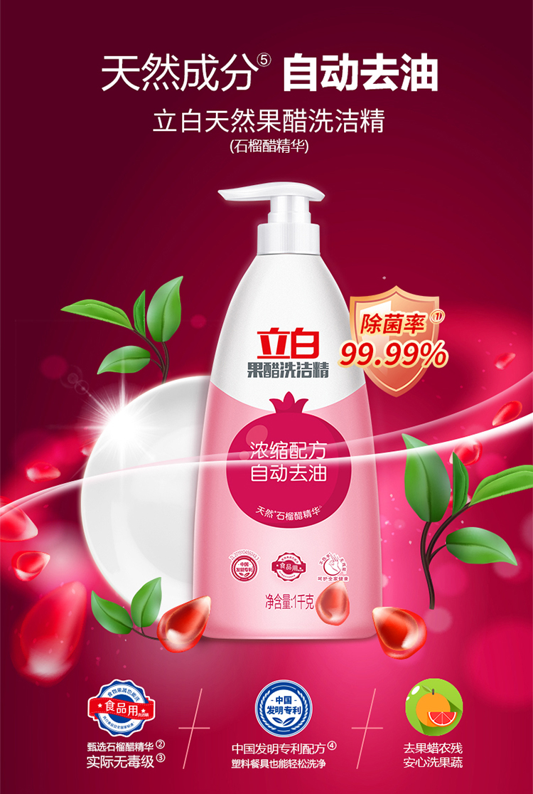 商品名称:立白果醋洗洁精1kg 厨具洗涤灵 食品级 石榴精华 果蔬清洗餐洗净 儿童餐具洗洁剂 自动去油安全配方