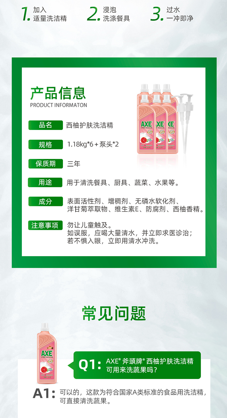 - 商品名称:斧头牌(AXE)西柚护肤洗洁精1.18kg 超值6瓶装 除腥辟味 维E呵护不伤手