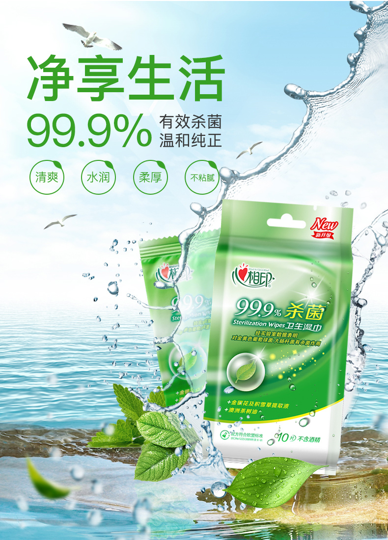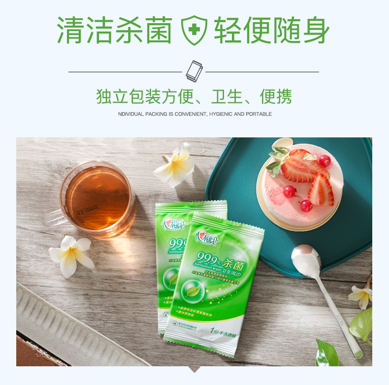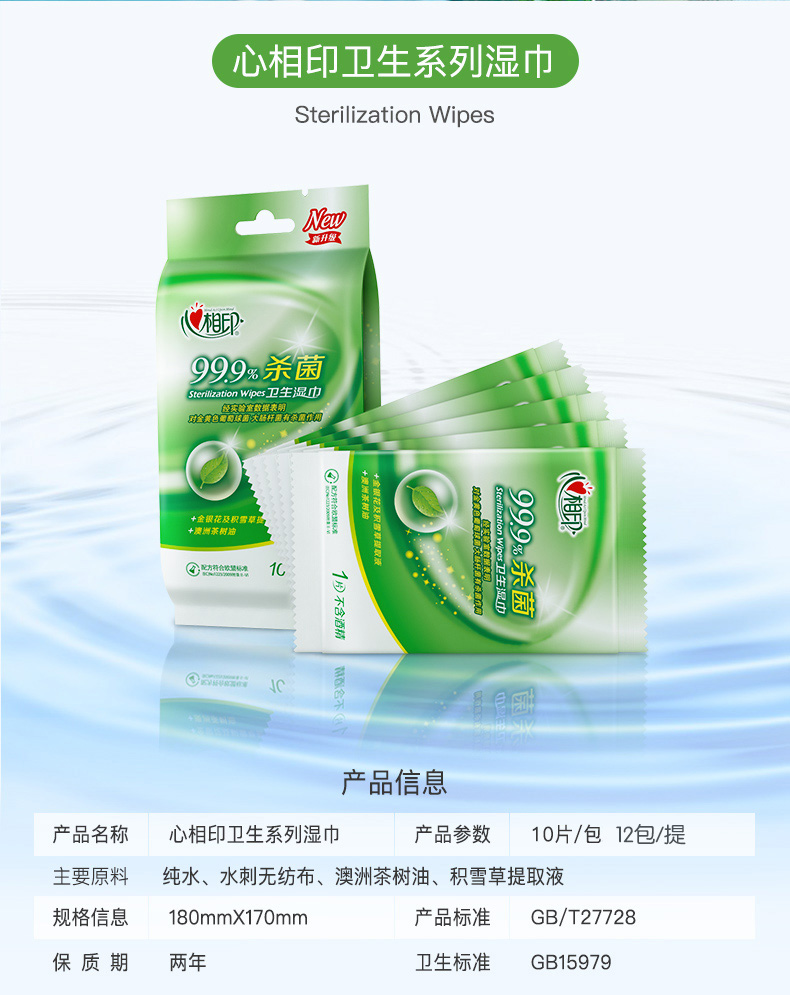 商品名称:心相印湿巾 卫生99.9%杀菌湿巾 10片独立装*12包 (量贩装)120片便携湿巾