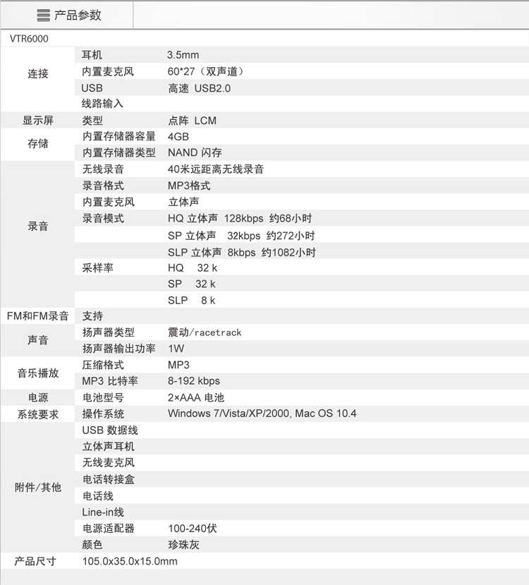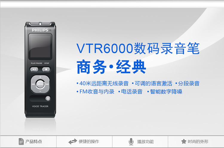 商品名称:飞利浦(PHILIPS) VTR6000 4GB 40米无线录音 麦克风录音笔 锖色