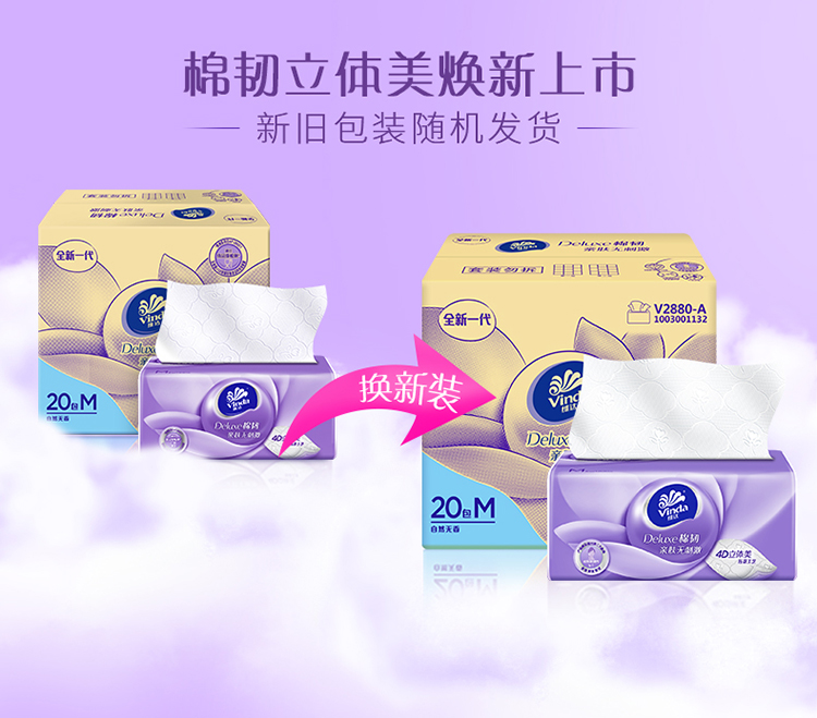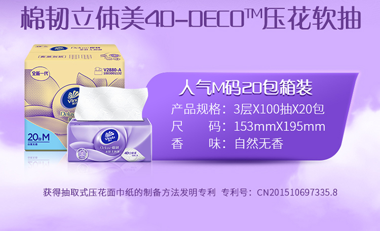 商品名称:维达(Vinda) 抽纸 棉韧立体美系列3层100抽软抽*20包 (认准真M码) 母婴可用 整箱销售 亲肤无刺激