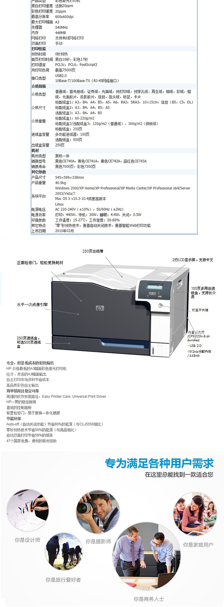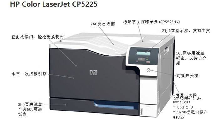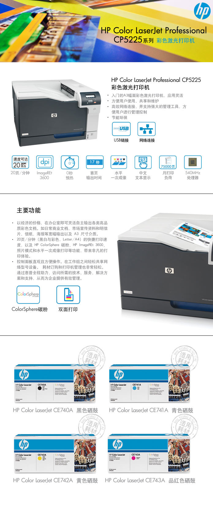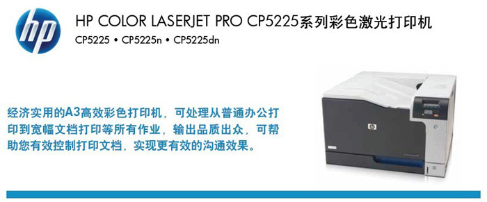商品名称:惠普(HP)Color LaserJet Pro CP5225n 彩色激光打印机 A3幅面 有线网络 手动双面打印 2年下一个工作日上门