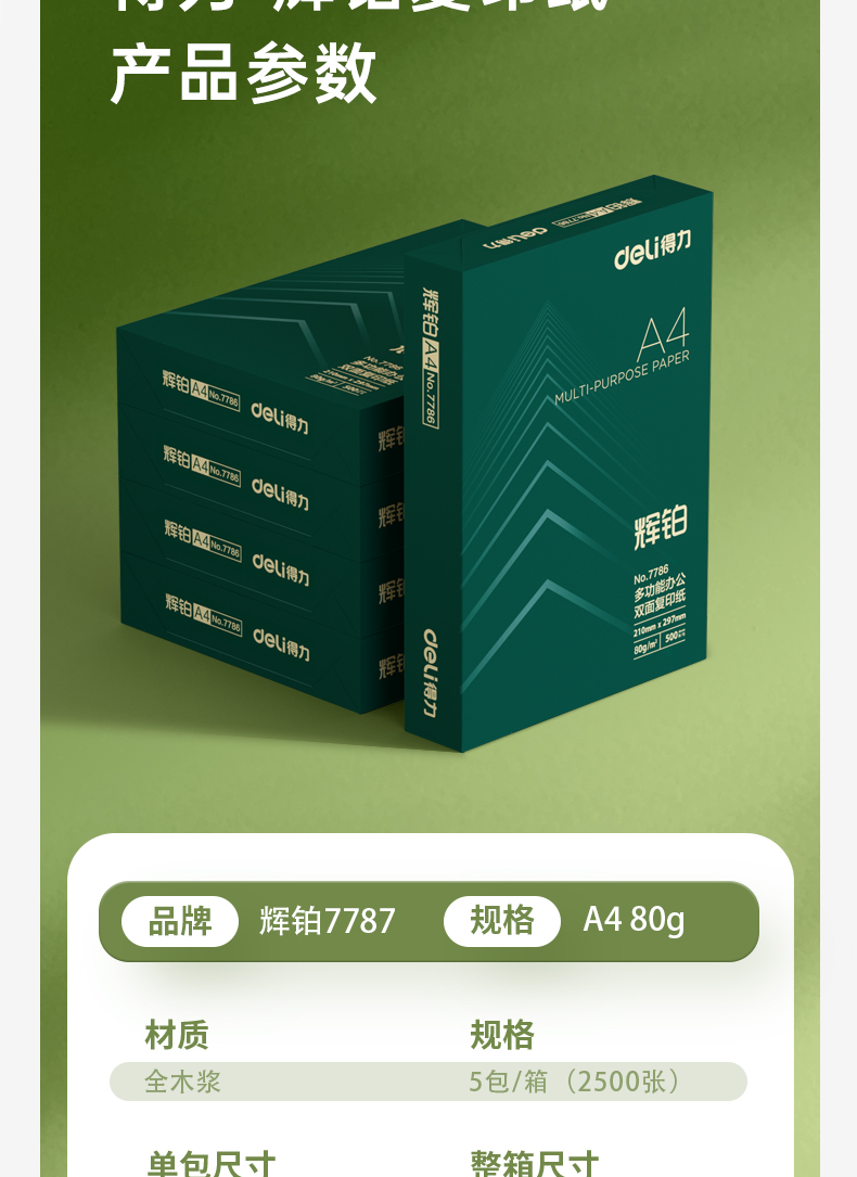 商品名称:得力(deli)辉铂 80g A4 复印纸 中档升级款打印纸 500张/包 5包1箱(整箱2500张)