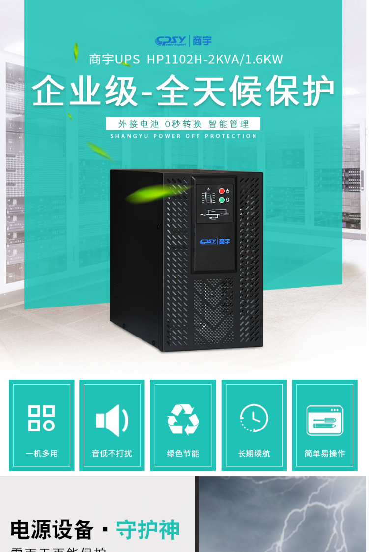 - 商品名称:商宇UPS不间断电源HP1102H在线式稳压延时2KVA 1600W外接电池单主机