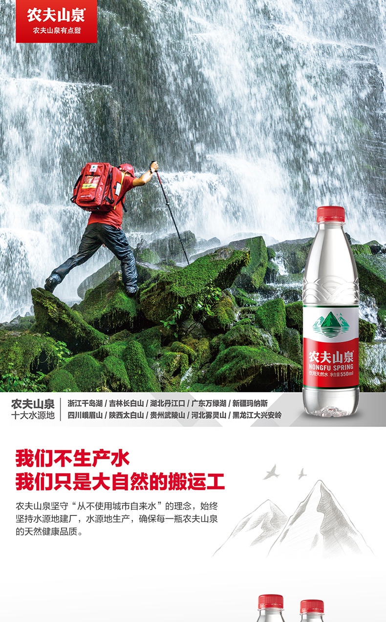 - 由于农夫山泉采取的是“水源地建厂,水源地灌装”、“水源地就近区域销售”的策略,各地购买到的农夫山泉水源地不尽相同,具体以瓶身标准为准