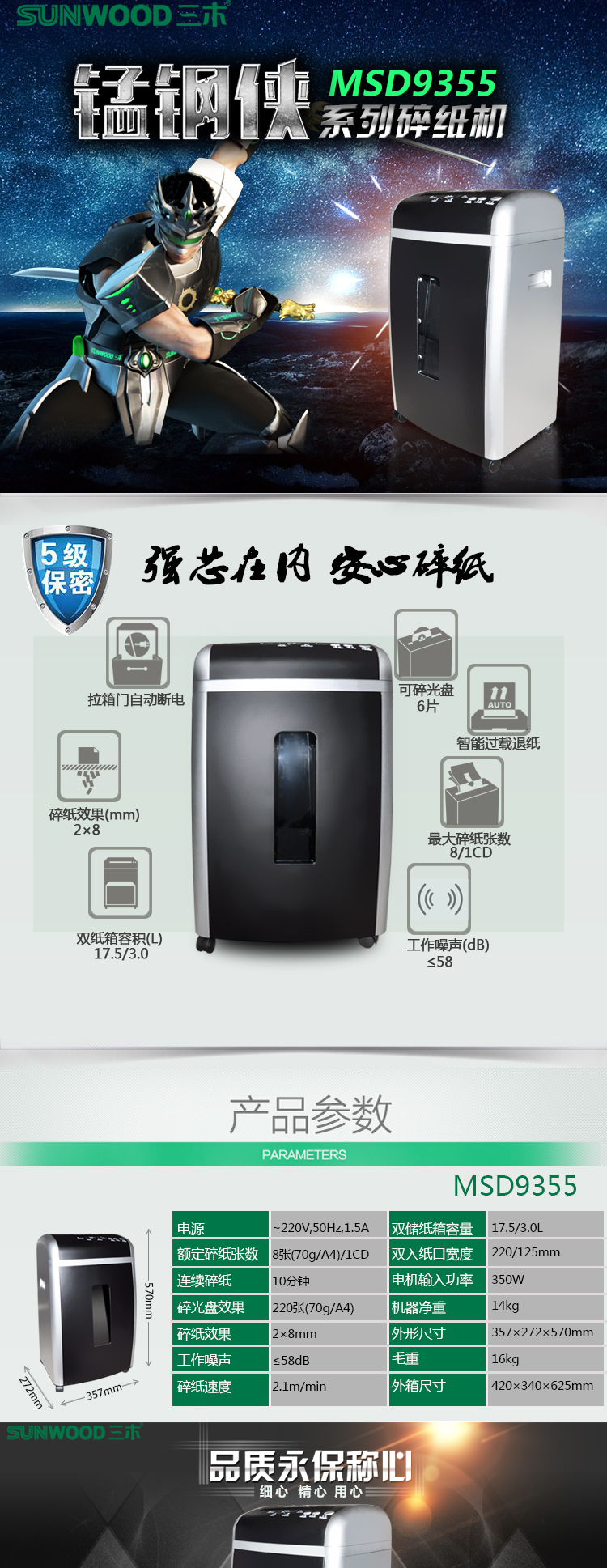 商品名称:三木(SUNWOOD) MSD9355 锰钢侠系列碎纸机/文件粉碎机 五级保密 双入口