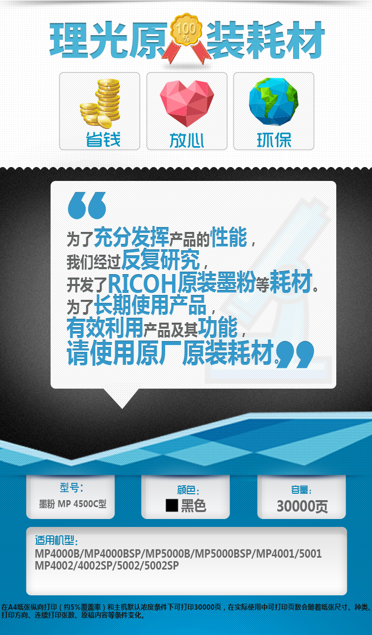 - 商品名称:理光(Ricoh)MP 4500C 碳粉1支装 适用MP4000B/4000BSP/5000B/5000BSP/4001/5001/4002/4002SP/5002/5002SP