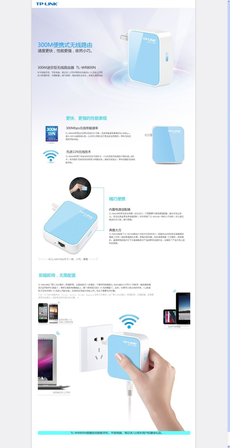 TL-WR800N就是一款真正做到即插即用的无线路由器。出差或旅行途中入住酒店,只需要把酒店房间里提供的网线插到TL-WR800N的以太网口,再把它插到电源插座上,整个房间就已经是Wi-Fi无线覆盖了。此时,你便可以拿出你的手机、Pad或是其它任何支持Wi-Fi无线上网的设备,在房间任何地方无线上网,完全不需要任何设置。