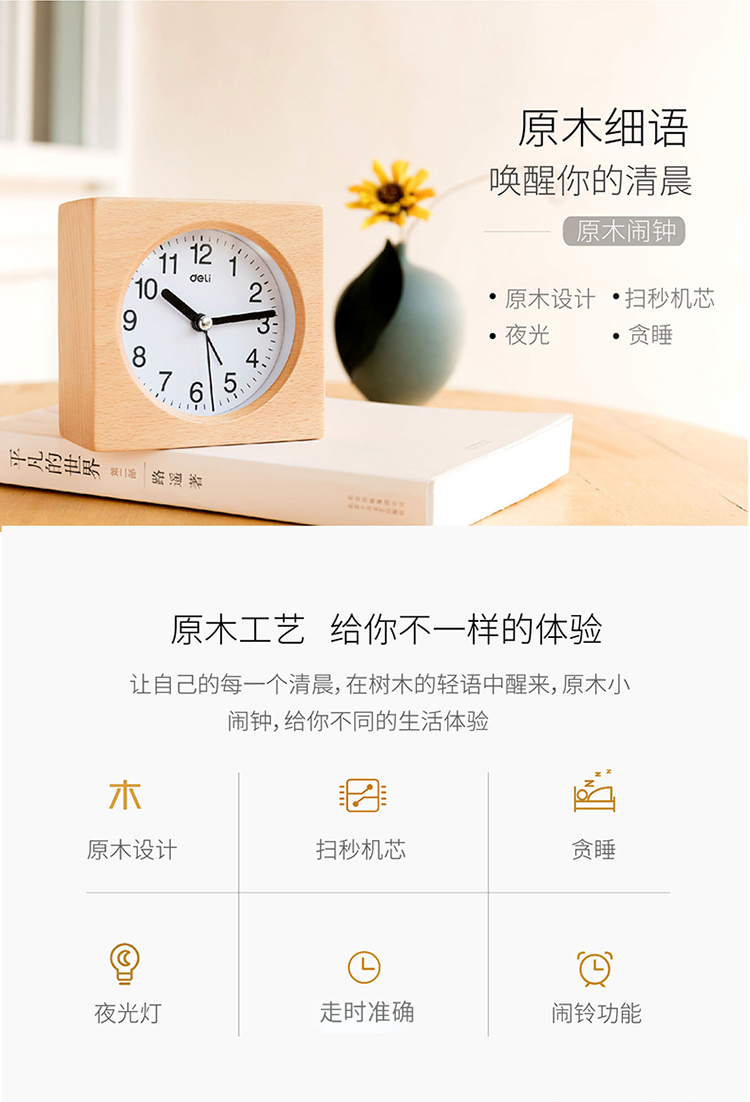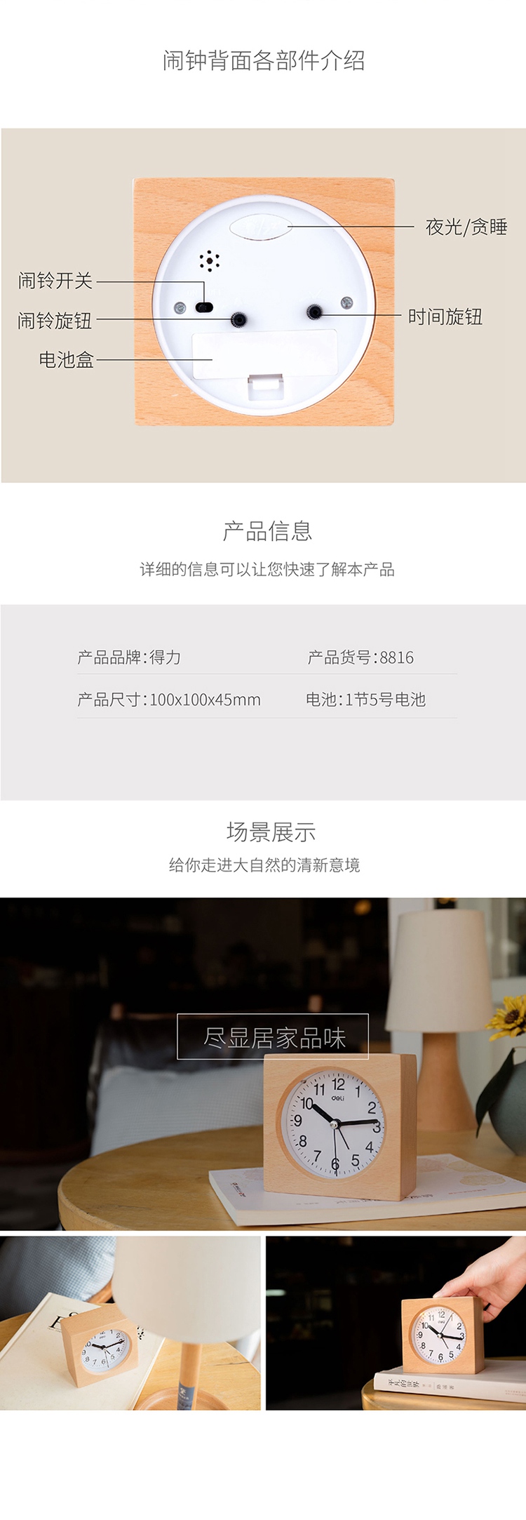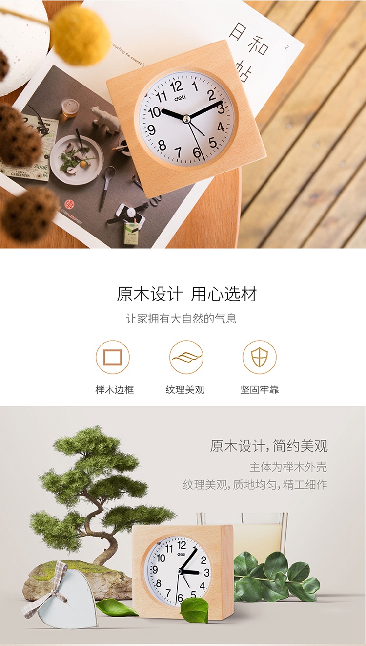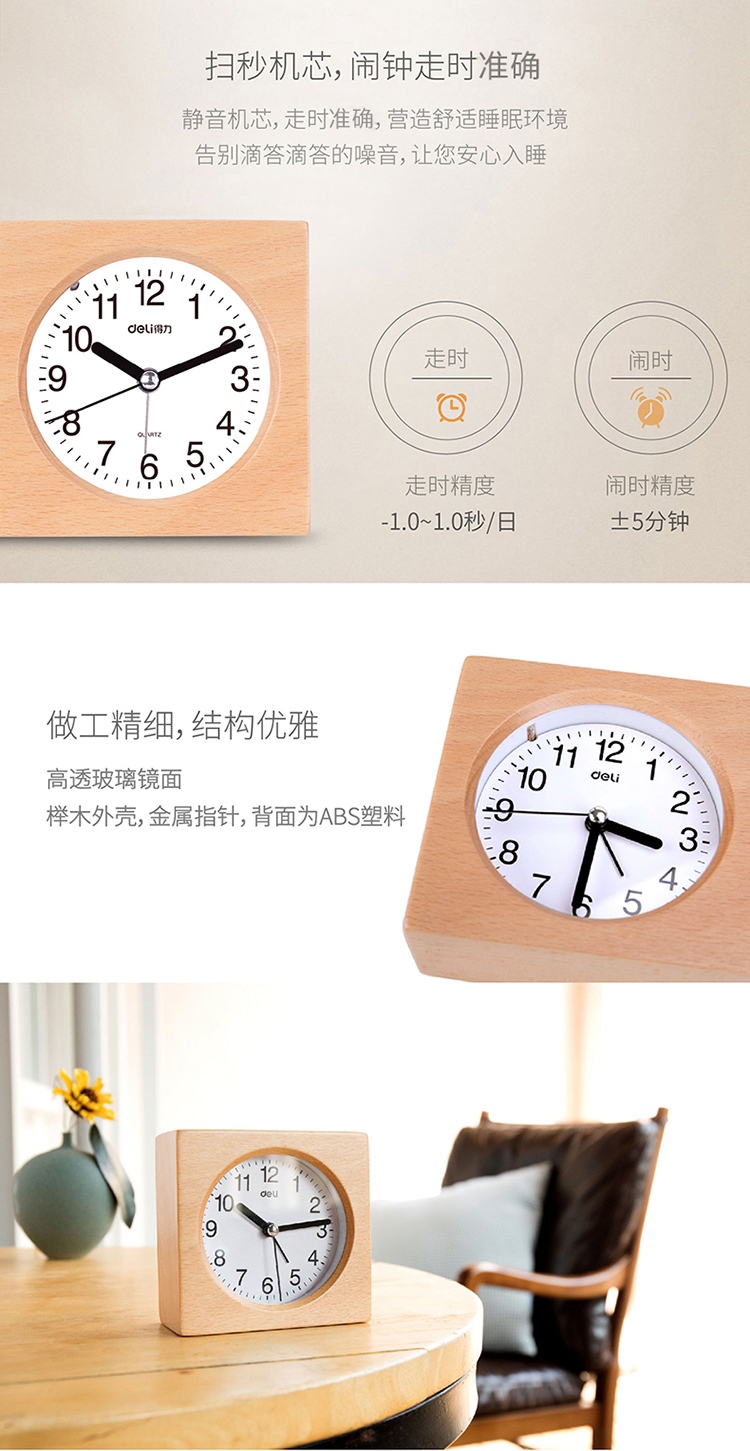 商品名称:得力(deli) 静音正方形榉木闹钟贪睡闹钟 木纹色8816