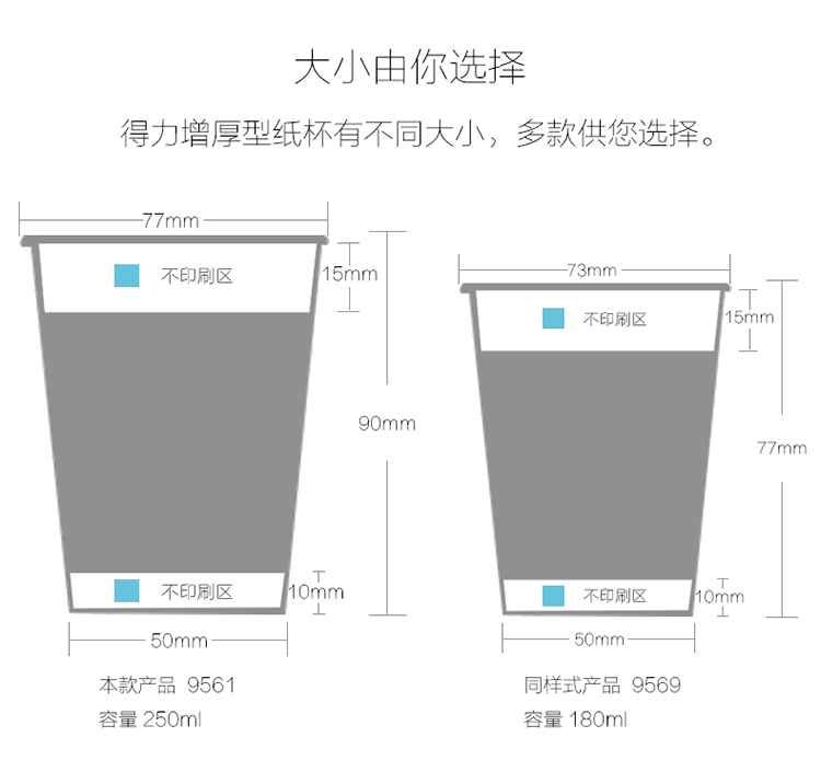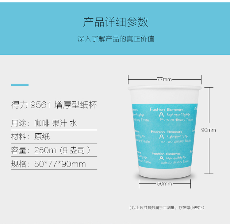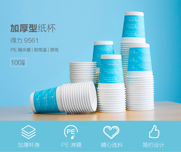 商品名称:得力(deli)9561 加厚型一次性水杯/纸杯9盎司 250ML 100只装蓝色