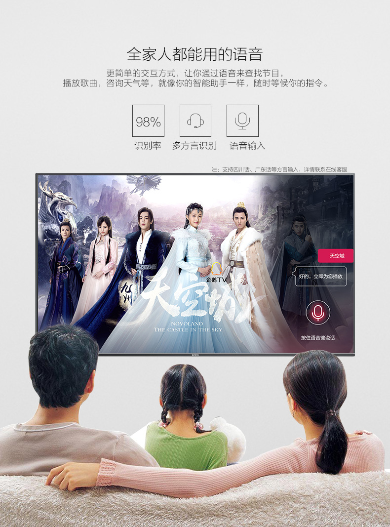 | 网络功能 | 有线/WiFi | 智能互联 | 语音操控,多屏互动(DLNA,AirPay),体感遥控( 支持移动端控制) |