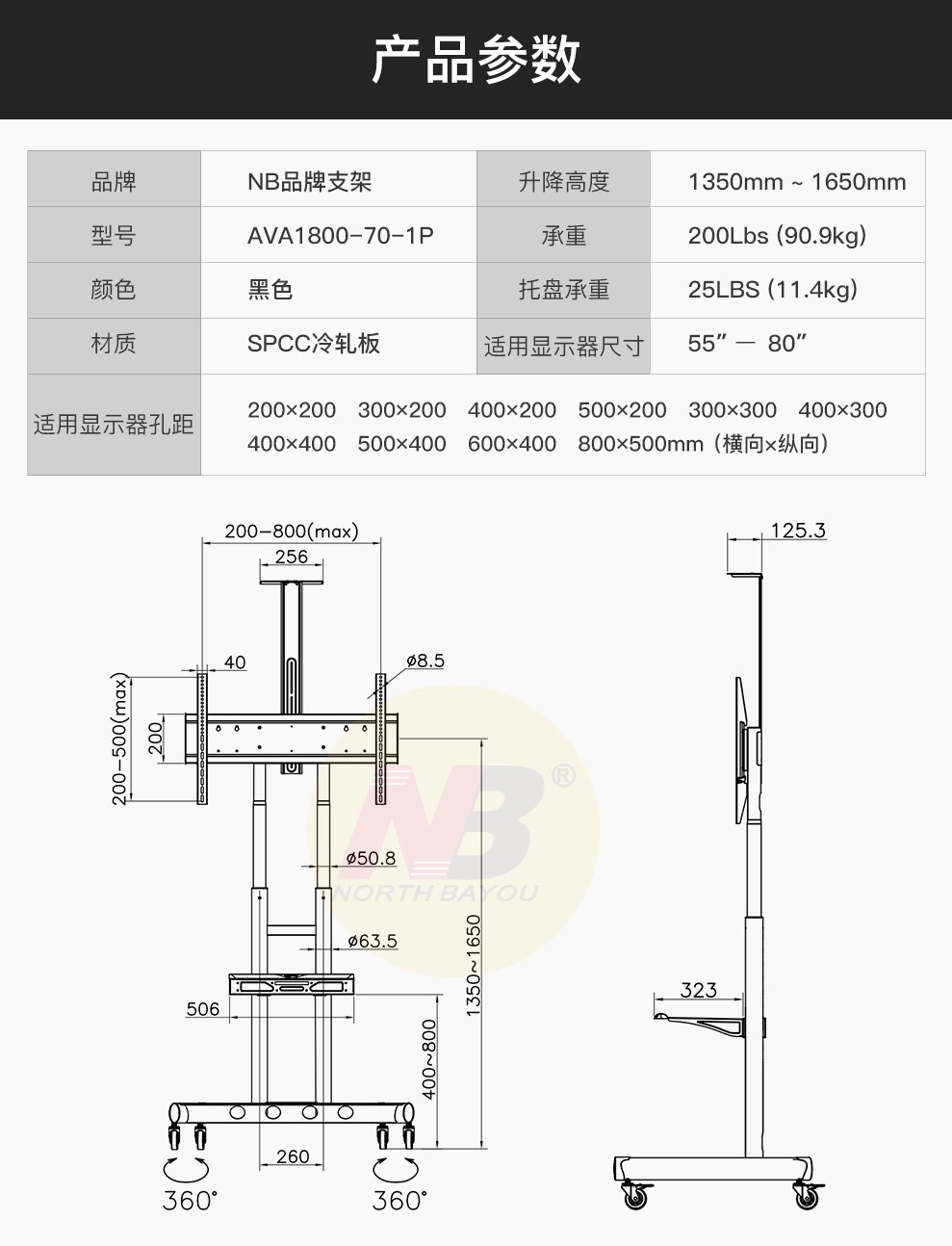 商品名称:NB AVA1800-70-1P (55-80英寸)通用液晶电视移动挂架