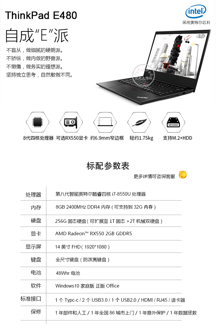 商品名称:联想 翼E480(20KNA010CD)14英寸轻薄游戏商务笔记本电脑 8G内存256G固态FHD高清屏