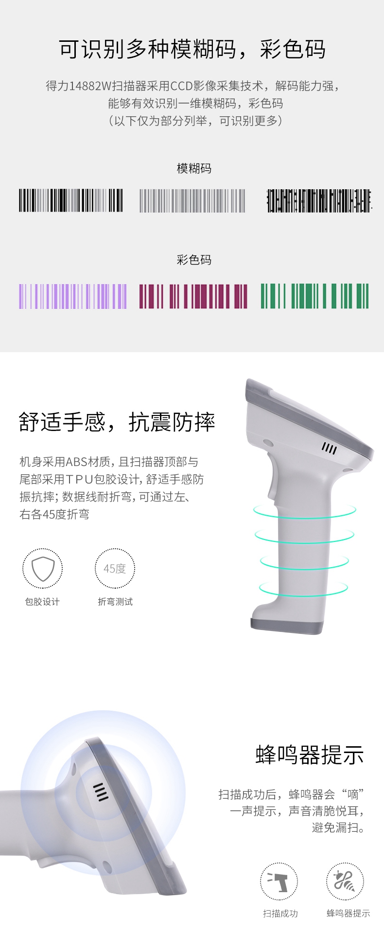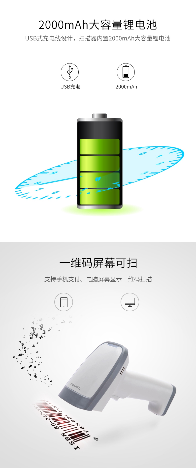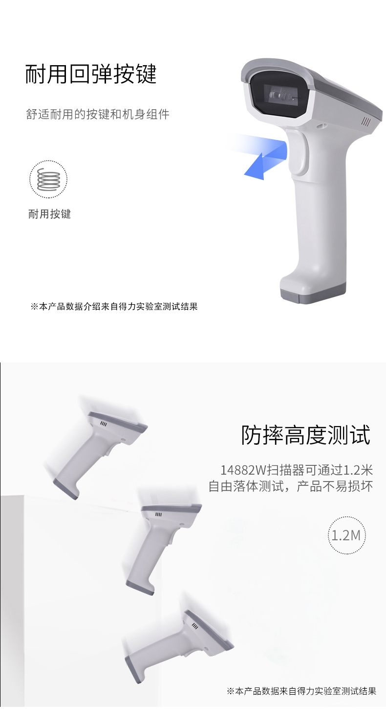 商品名称:得力(deli)无线扫描枪收银手机支付扫码枪 14882W白