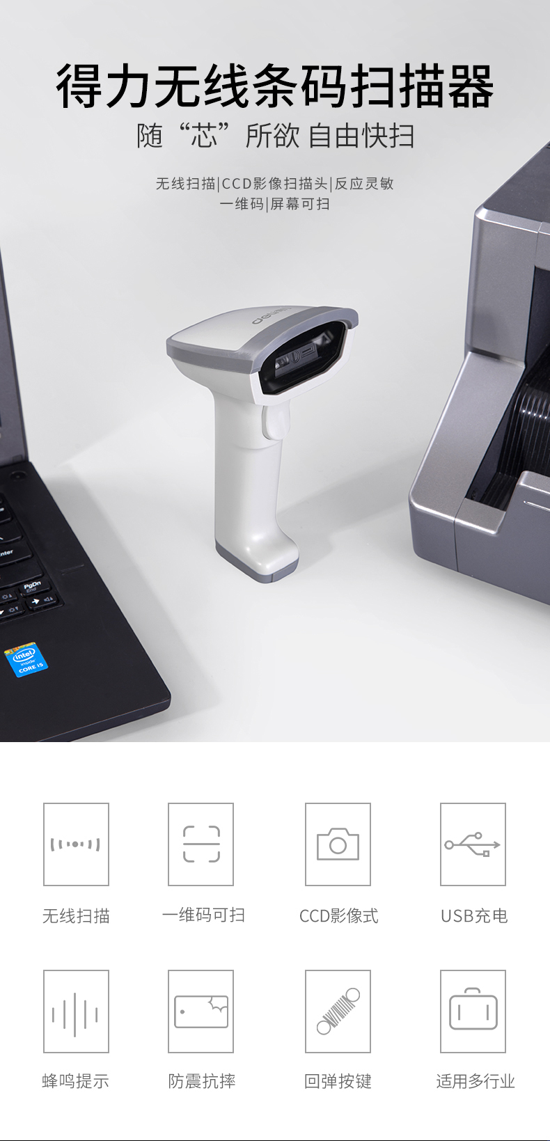 得力(deli)无线扫描枪收银手机支付扫码枪 14882W白
