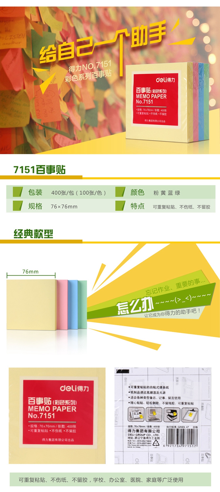 - 商品名称:得力(deli) 7151 76×76mm/400页便签纸/便利贴/百事贴/ 4色/本