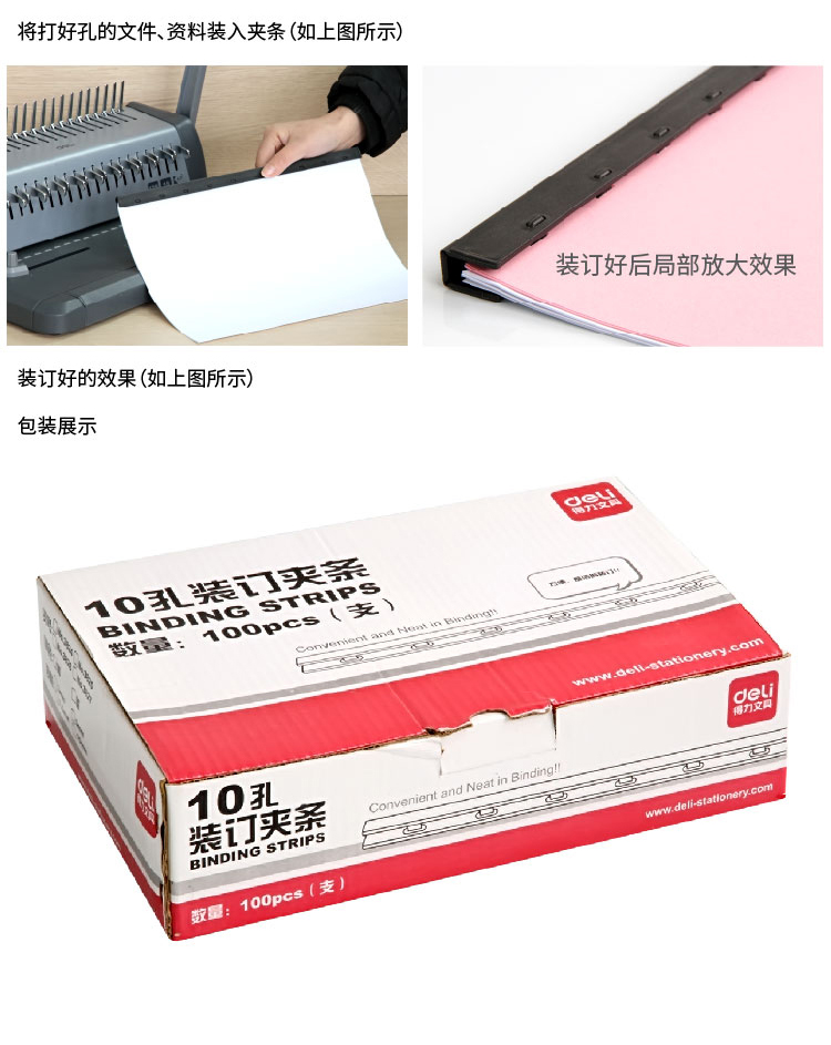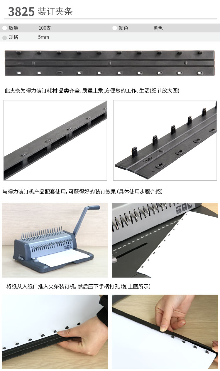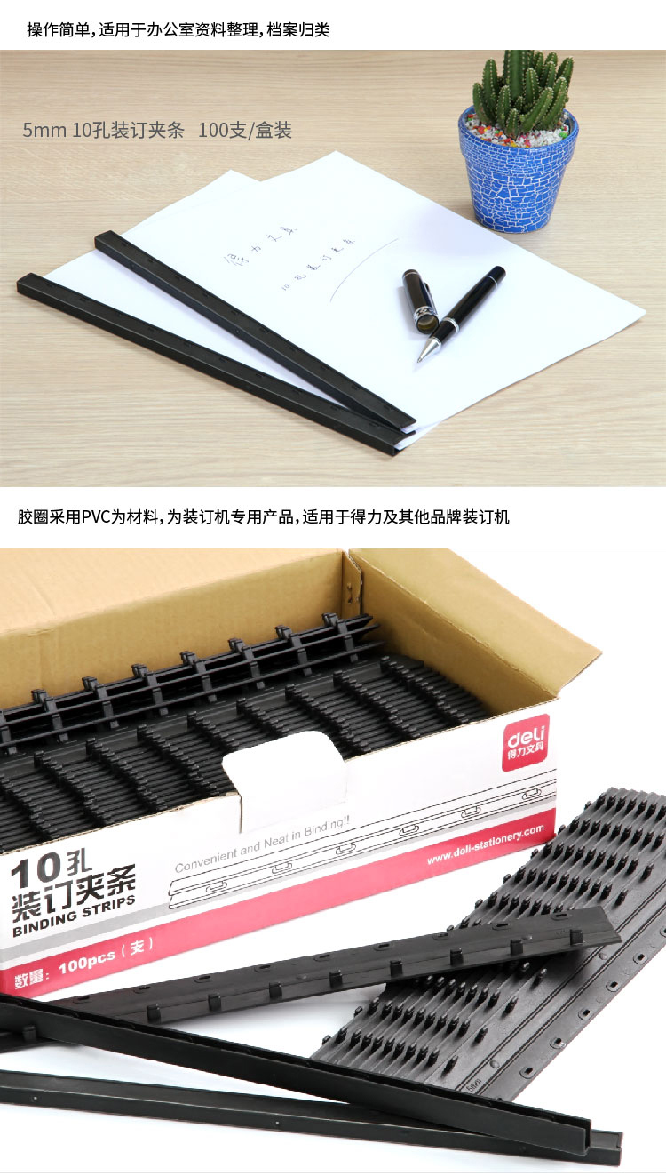 商品名称:得力(deli) 3825 10孔装订夹条 5mm 蓝色 100支/盒装