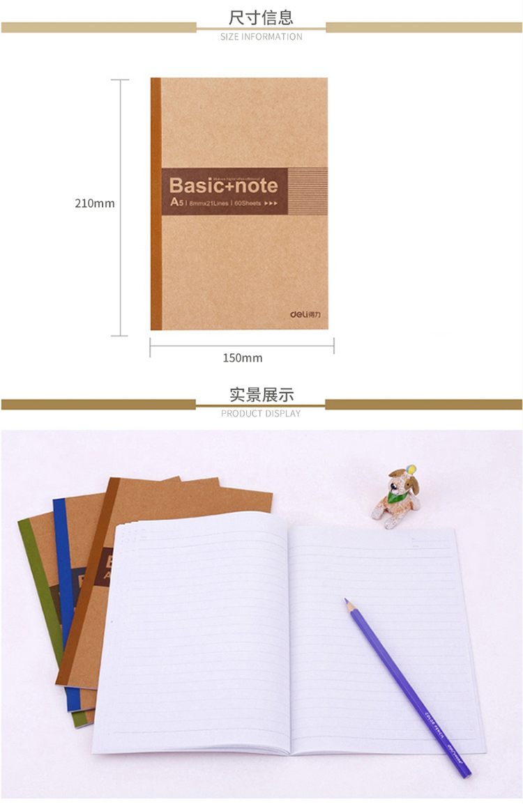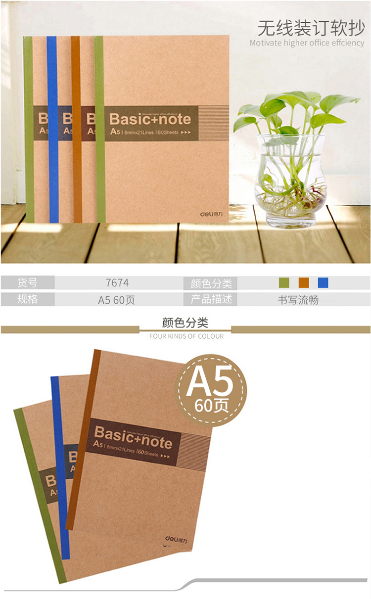 商品名称:得力(deli) 7674 A5/60页无线装订软抄本 办公记事本 蓝色