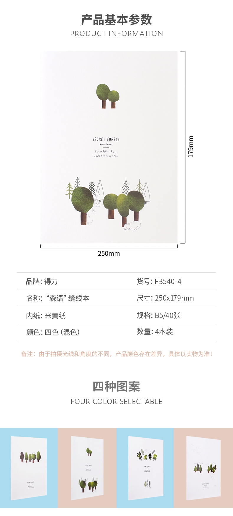 商品名称:得力(deli) FB540-4 4本B5/40页 森语系列 缝线软抄本 记事本(4本/包)