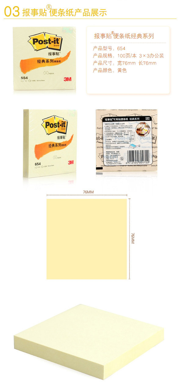 - 商品名称:3M 654 报事贴 便利贴 经典系列 76*76mm(黄色)