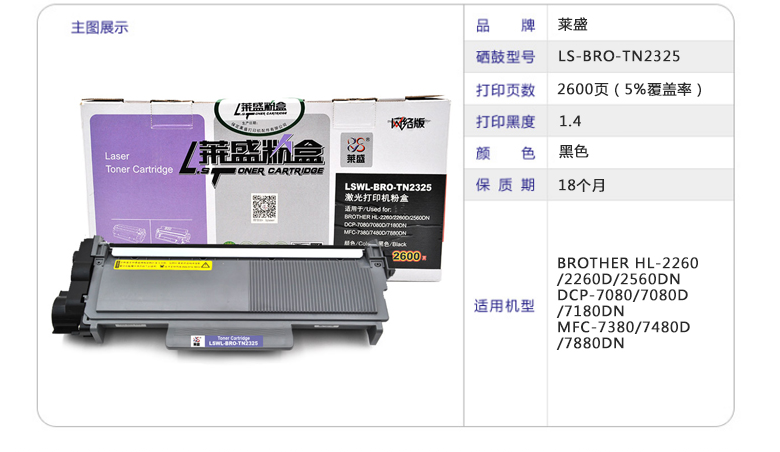 - 商品名称:莱盛 LSWL-BRO-TN2325 激光打印机粉盒 黑色 适用BROTHER HL-2260/2260D/2560DN DCP-7080/7080D/7180DN