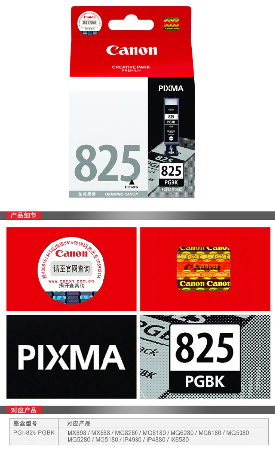 佳能(Canon)PGI-825 BK 黑色墨盒(适用MX898、MG6280、iP4980、iX6580)