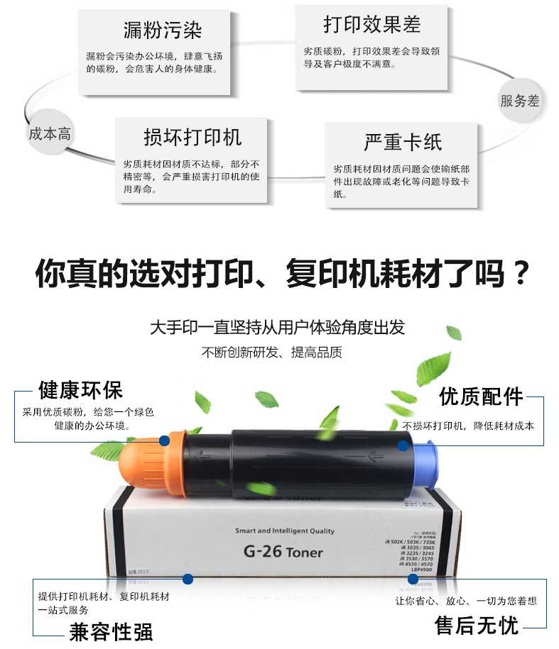 商品名称:大手印 复印机标准粉盒 G-26 佳能G-26 适用Canon iR502K/503K/735K/3035/3045/3235/3245/3530/3570/4530/4570/3045N/3235N/3245N