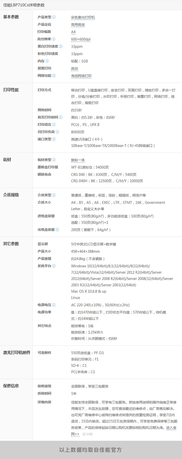 商品名称:佳能(Canon)imageCLASS LBP710Cx 激光式打印机 官方标配 白色