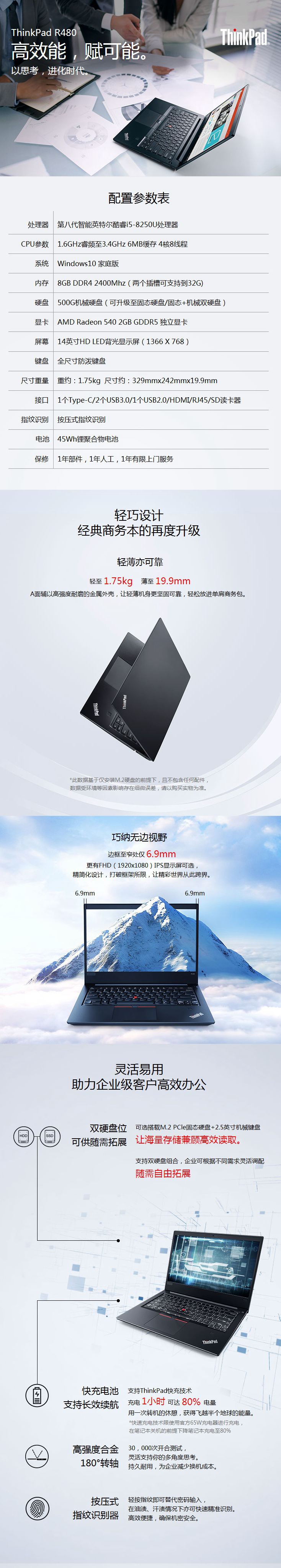 - 商品名称:联想(ThinkPad)R480-20KRA004CD 笔记本电脑(I5-8250U//8GB/500GB机械硬盘/2GB独显/14英寸HD显示屏/Windows10 家庭版/1年部件/1年人工/1年上门服务)