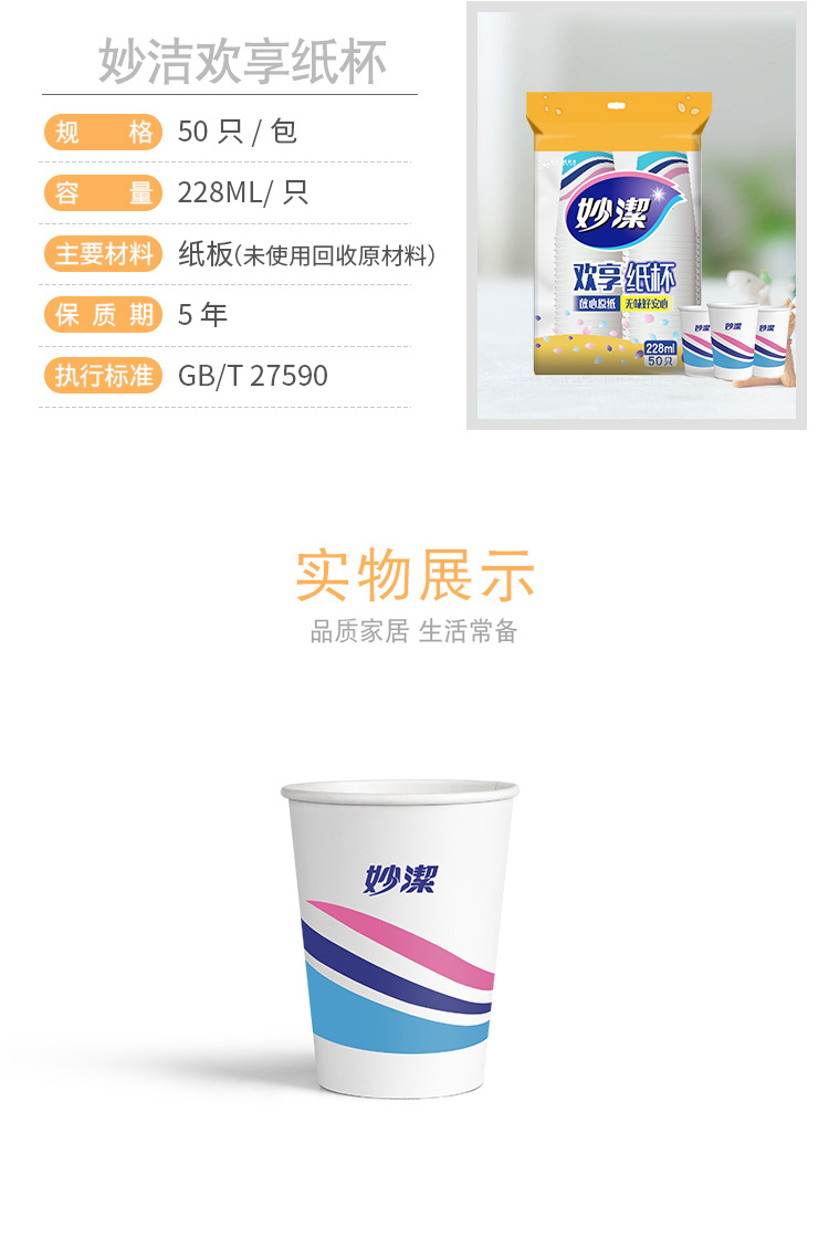 - 商品名称:妙洁(MIAOJIE) 一次性纸杯228ml 50个/包