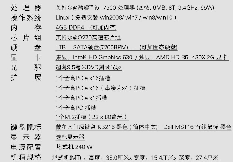 商品名称:戴尔(DELL)OptiPlex 7050 I5-7500/4GB/1TB/DVDRW/Win10 Home/键鼠/3年上门服务/E2417H 23.8寸