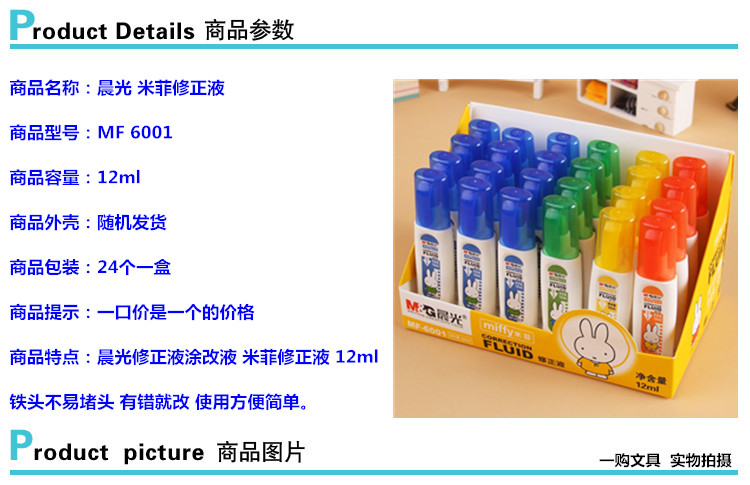 - 商品名称:晨光(M&G) MF-6001 米菲修正液 12ml 颜色随机 24瓶/盒