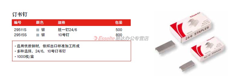 - 商品名称:易达(Esselte) 29511S 12# 订书钉 1000枚/盒