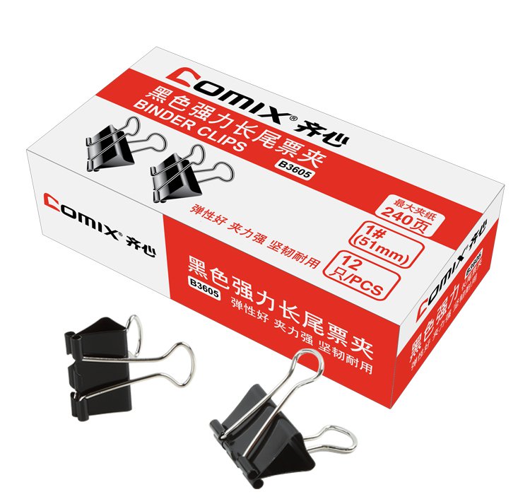 商品名称:齐心B3605黑色长尾单据票夹51mm12只纸盒装大号燕尾夹