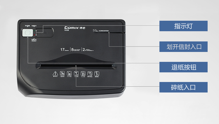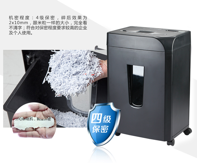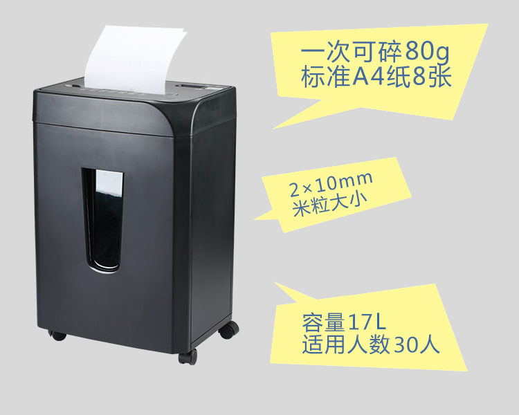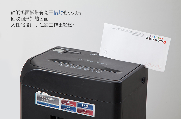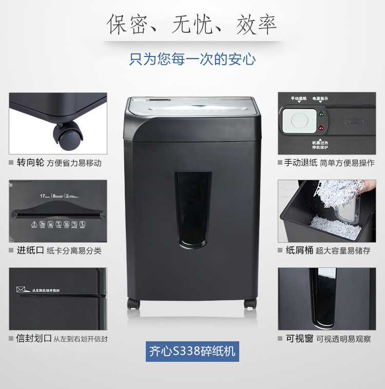 商品名称:齐心 S338 强力保密型碎纸机 2×10mm/8张纸/17L/单入口/续航10分钟
