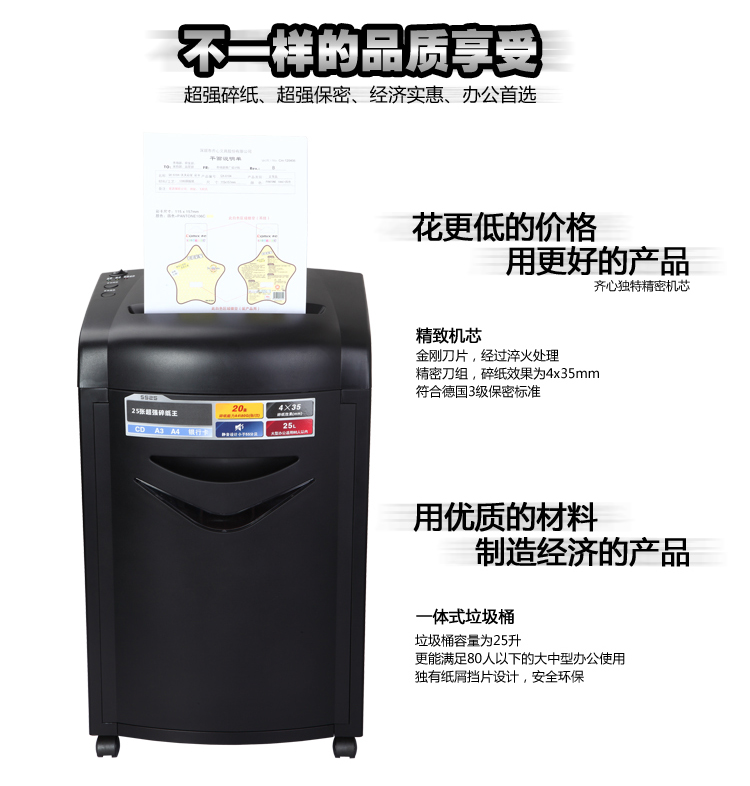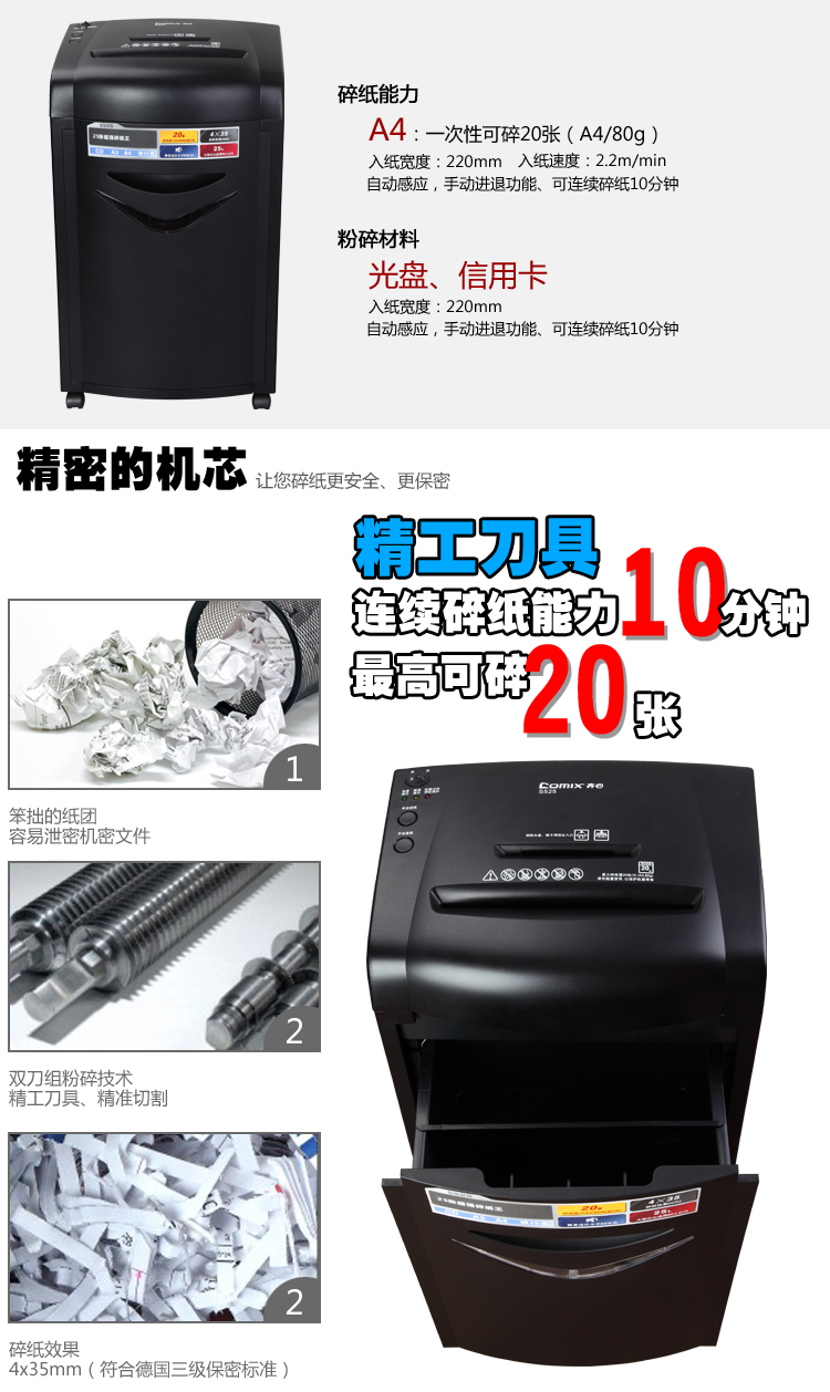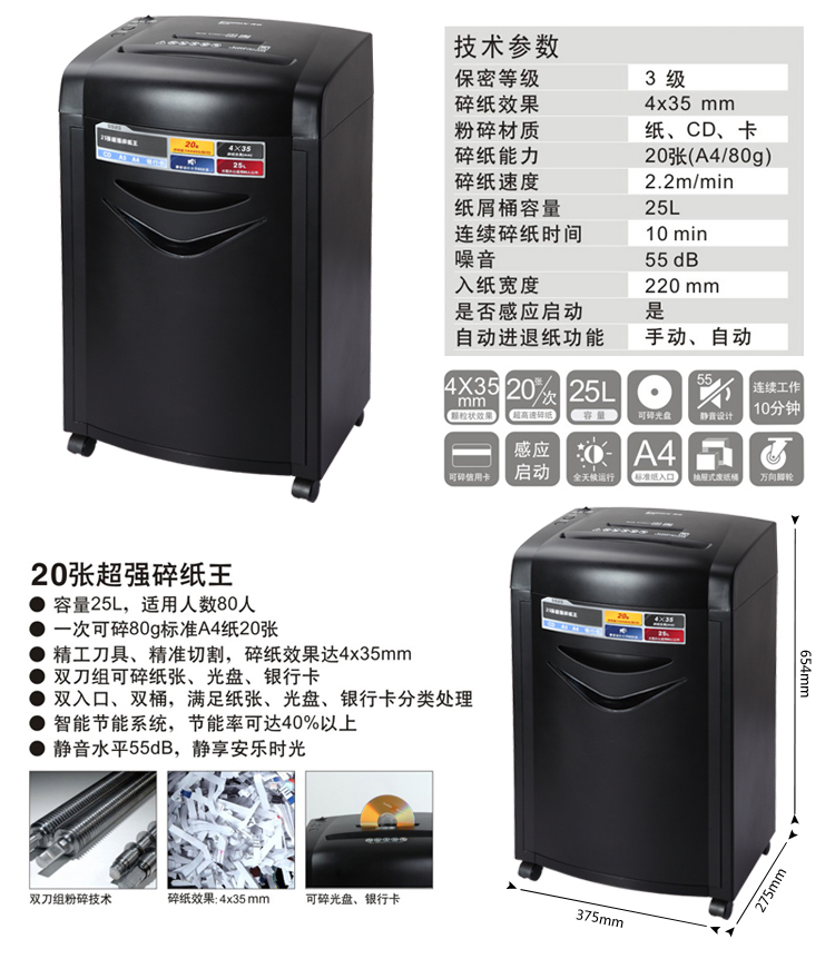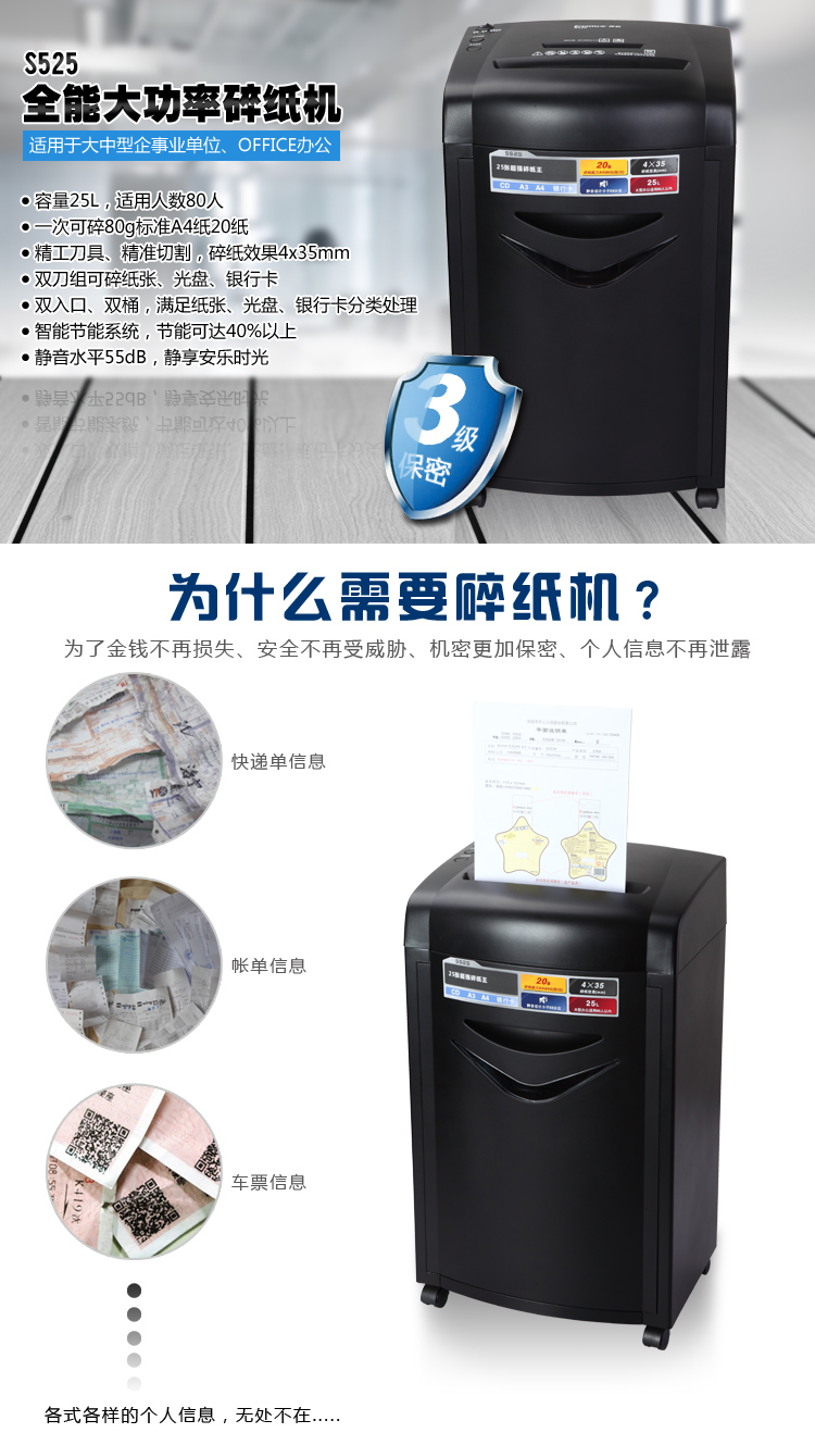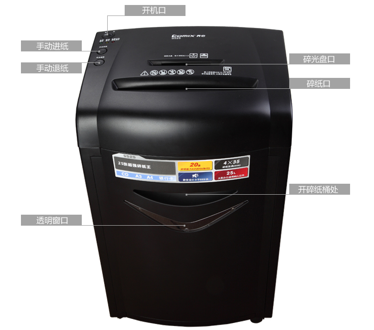 商品名称:齐心S525电动碎纸机碎光盘碎卡20张/次25L双入口4*40mm 续航10min