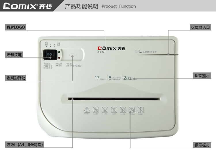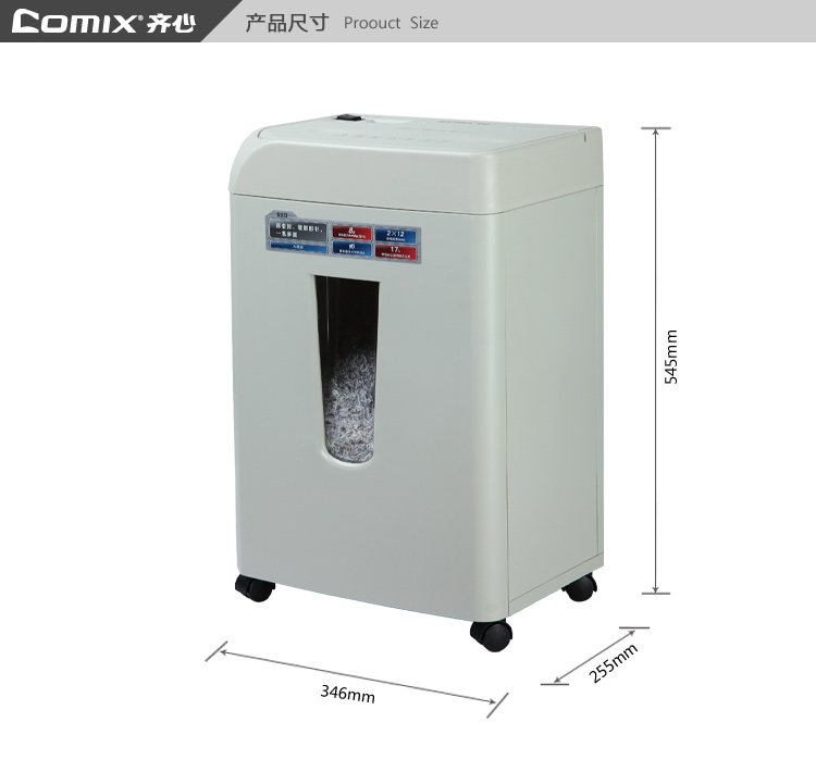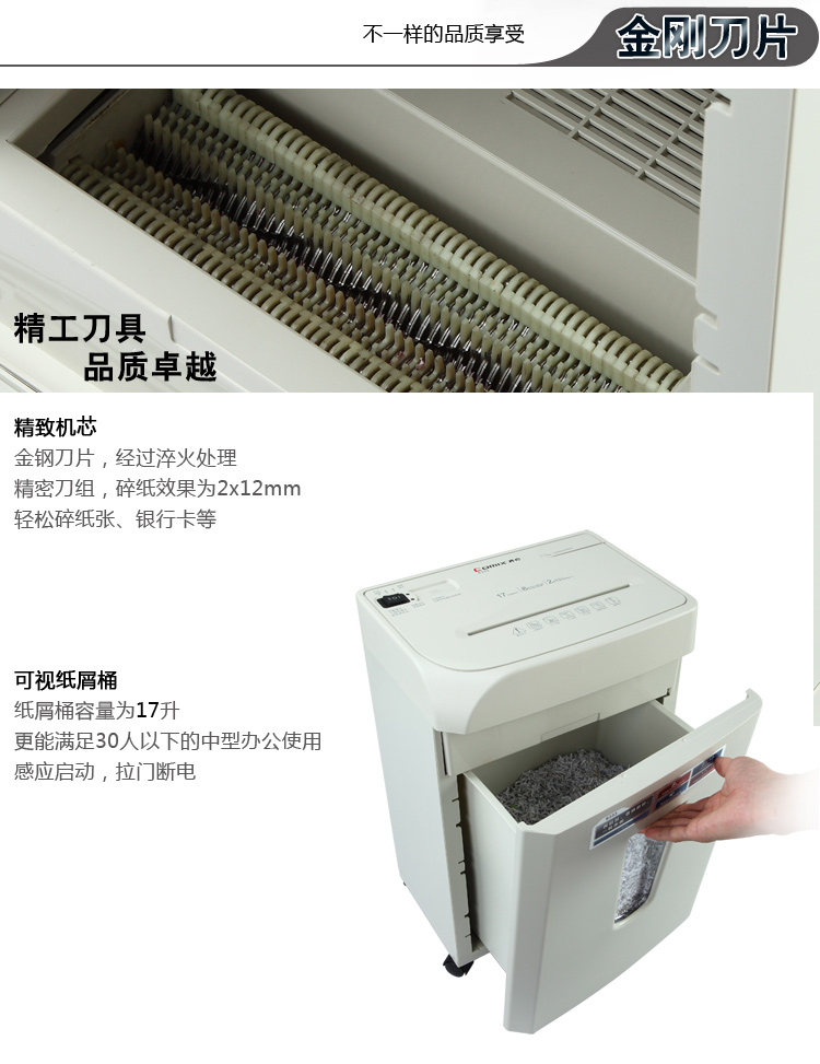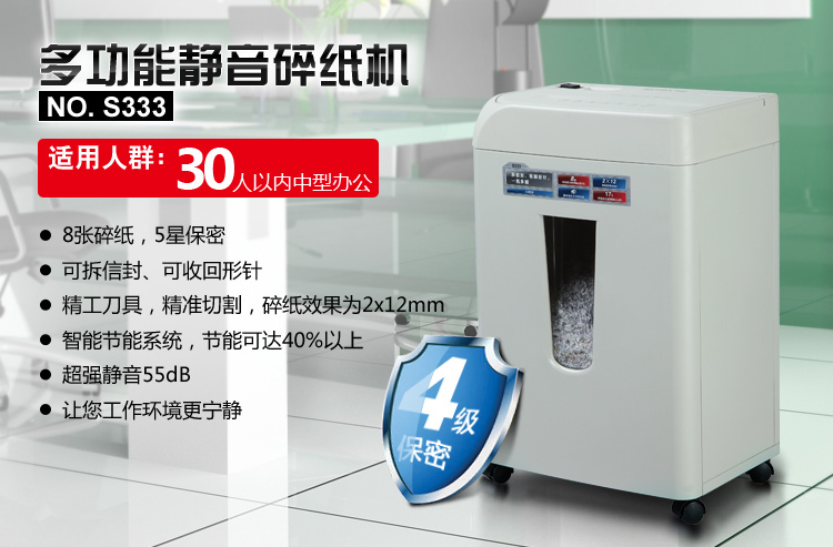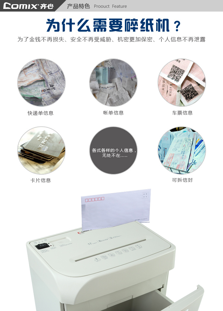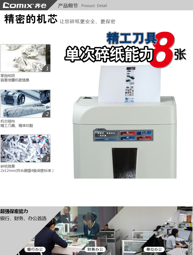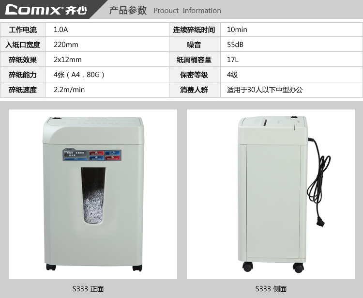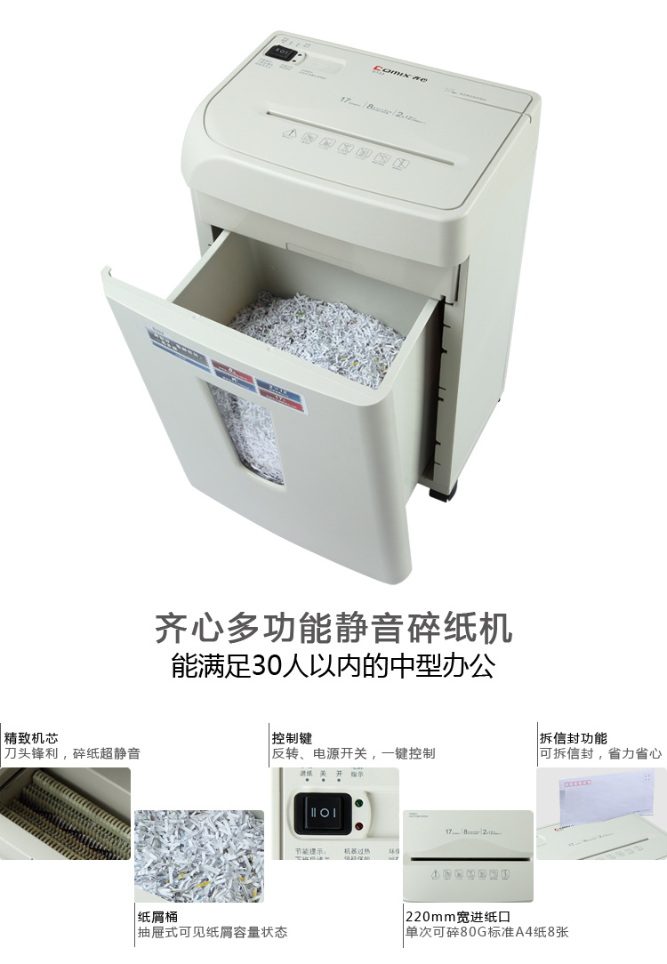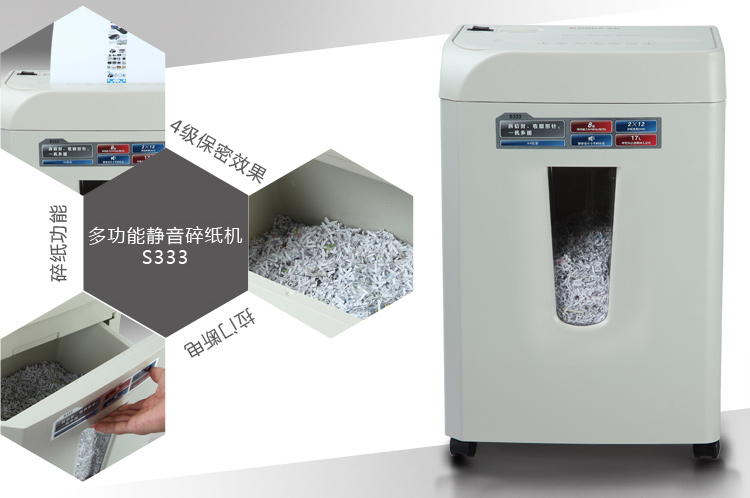 商品名称:齐心S333强力保密碎纸机2×12mm/8张纸17L/单入口拆信封续航10min