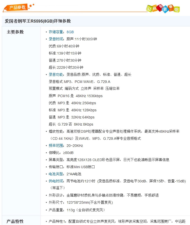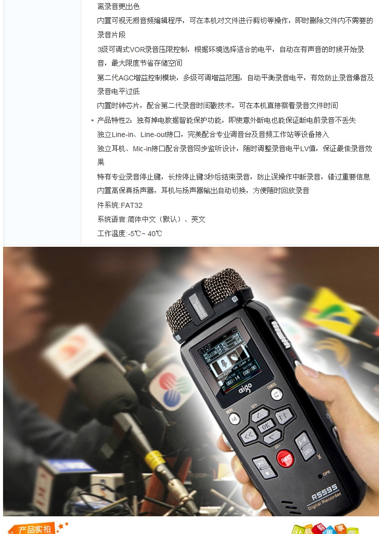 商品名称:aigo爱国者 R5595 高清晰双核录音笔 8G 黑色