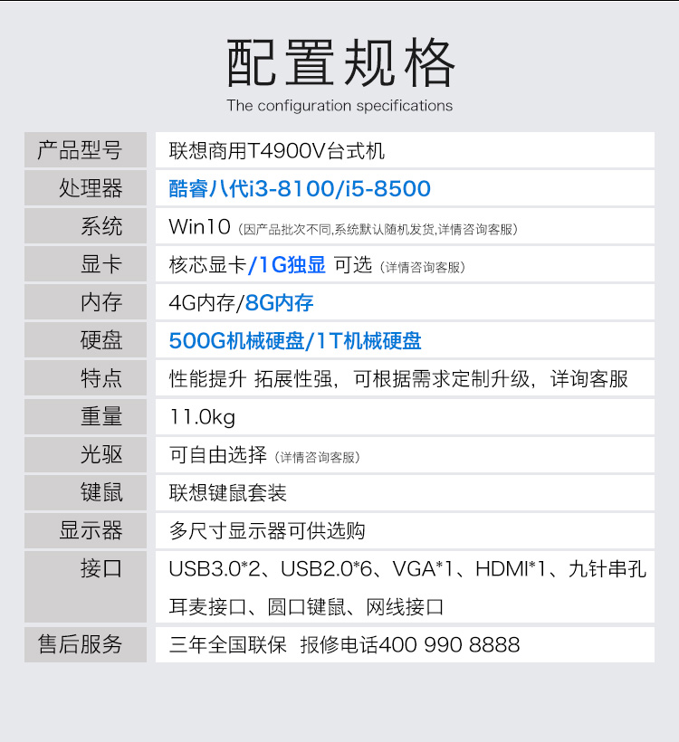 商品名称:联想(Lenovo)扬天 T4900v I5-8500/4G/1T/集显/WIN10/无光驱/19.5LED