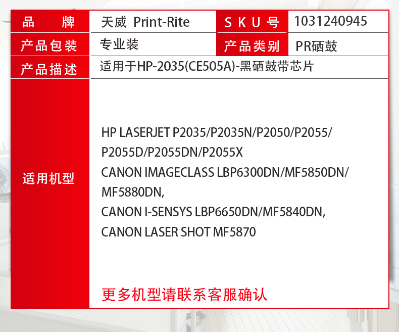 商品名称:天威 CE505A 专业装黑色硒鼓带芯片 适用惠普HP-2035 2035N P2050 P2055 P2055D Canon LBP6300dn MF5850dn MF5880dn TRH504BPEJ