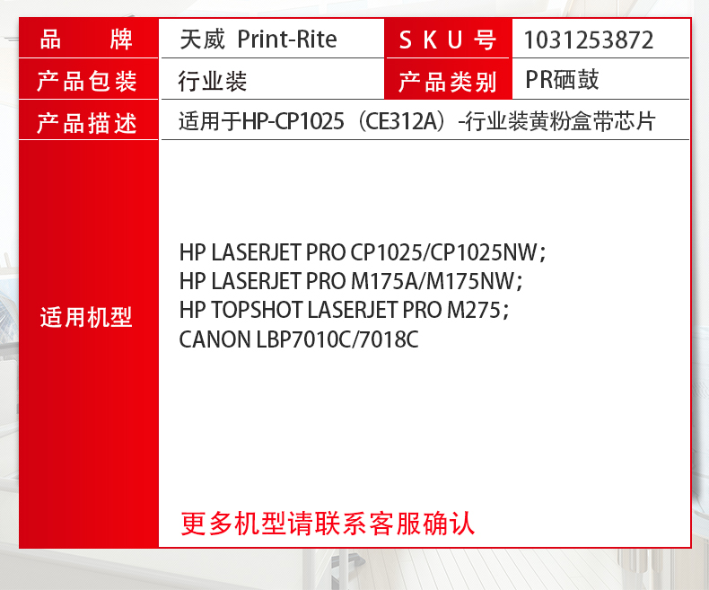 商品名称:天威 CE312A 行业装 适用惠普打印机粉盒带芯片 黄色 312A/312/12A HP LaserJet Pro CP1025/CP1025NW/PRO M175A/M175NW/HP TOPSHOT LASERJET PRO M275/Canon LBP7010C/7018C TRH809YP8J