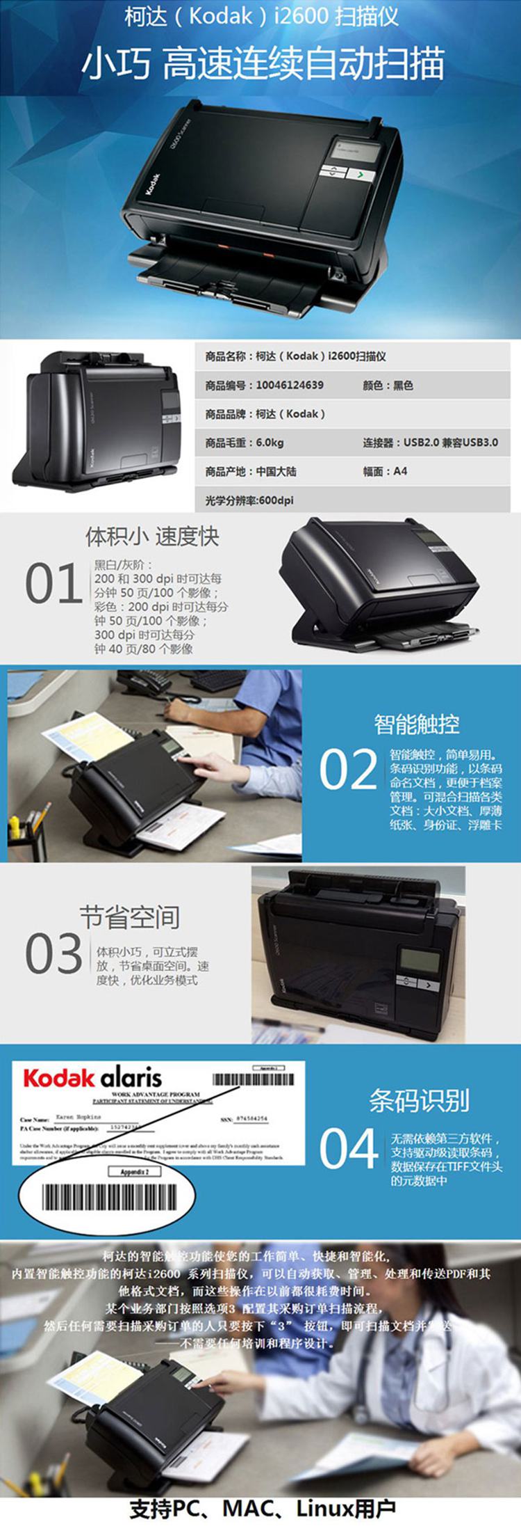 商品名称:柯达 高速扫描仪 i2600 A4幅面 扫描范围216×863mm