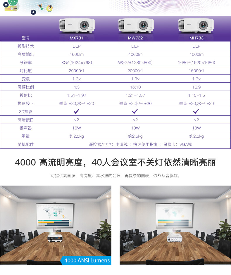 商品名称:明基(BenQ)MX731 投影仪 办公高清 会议工程投影机 (4000流明 标清)